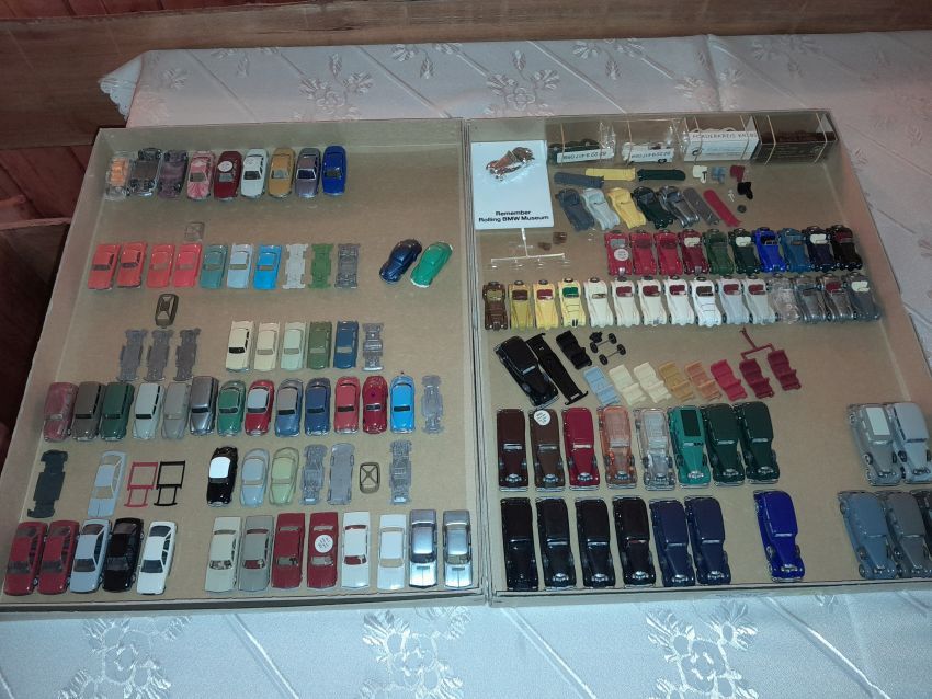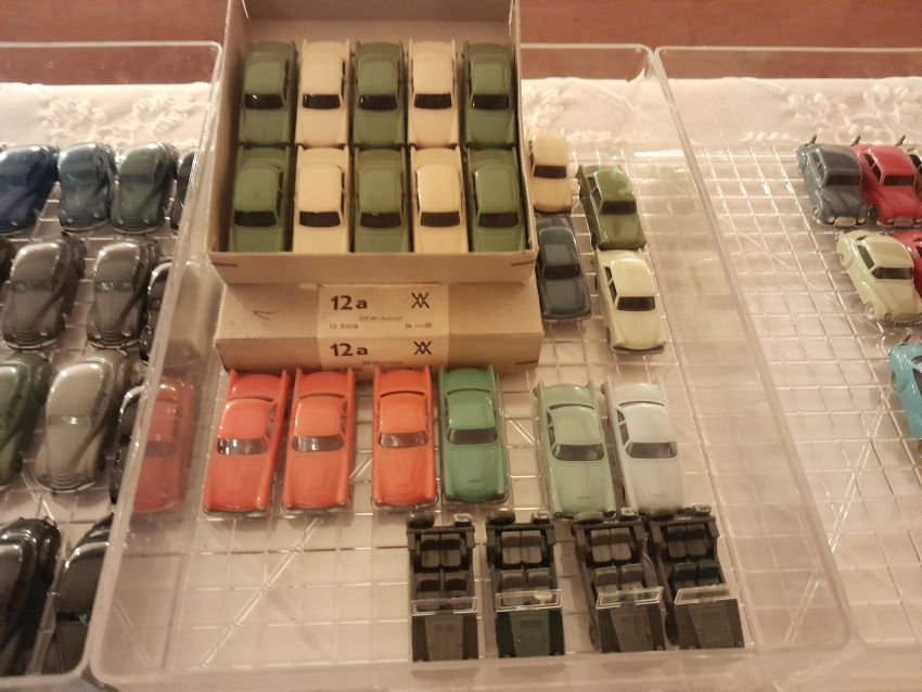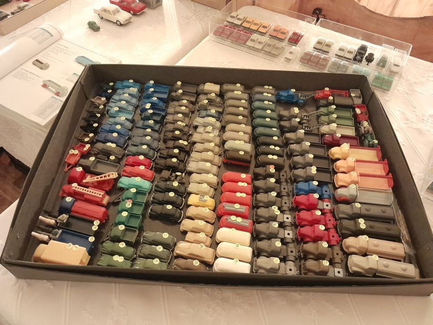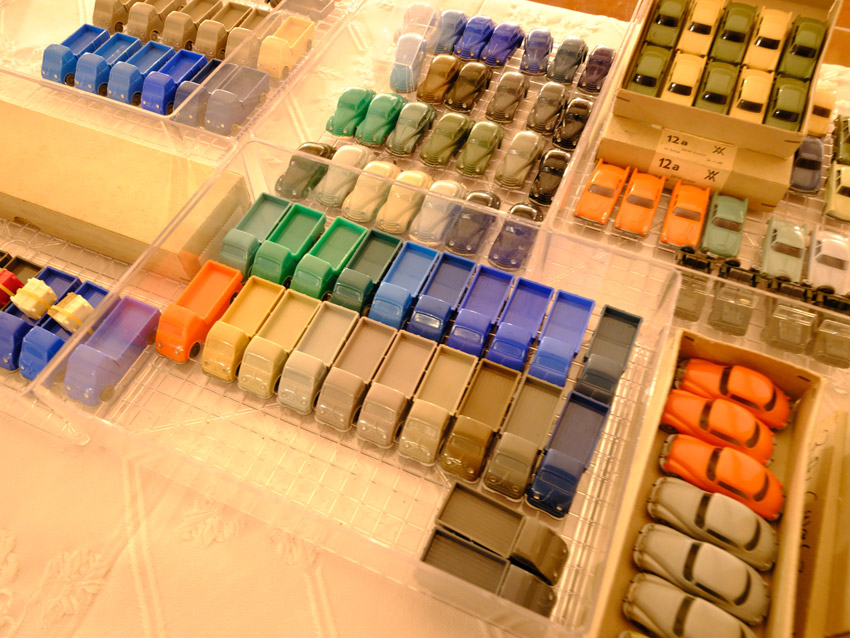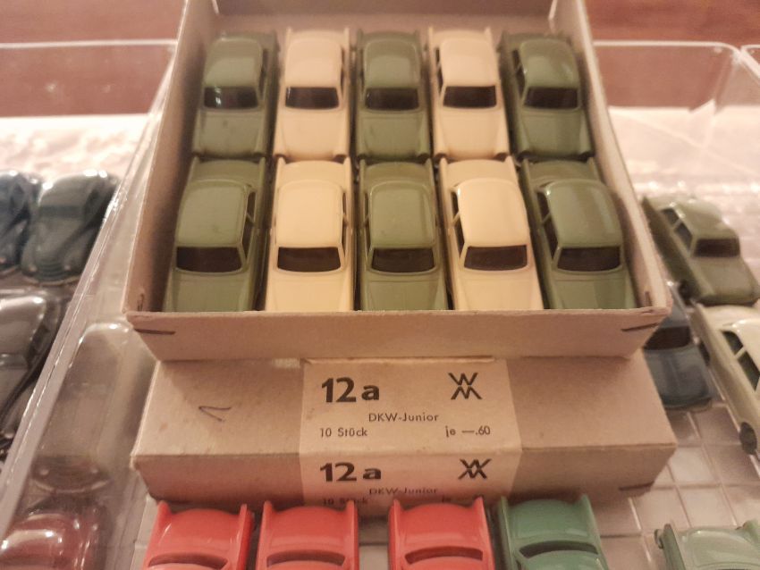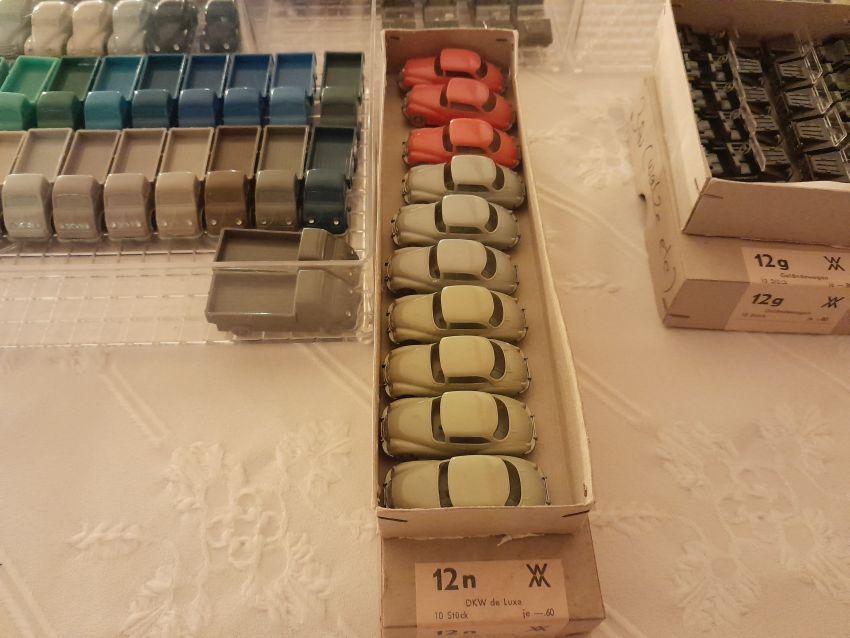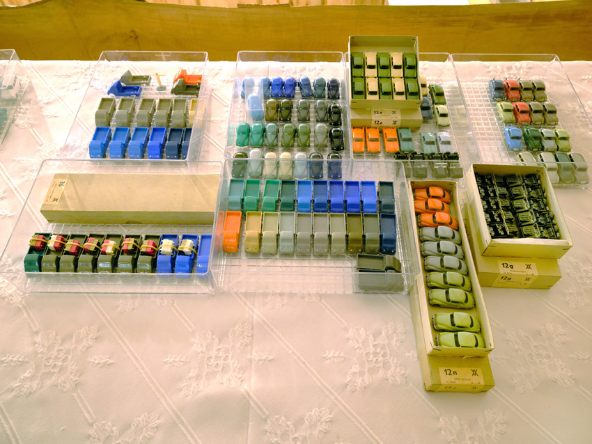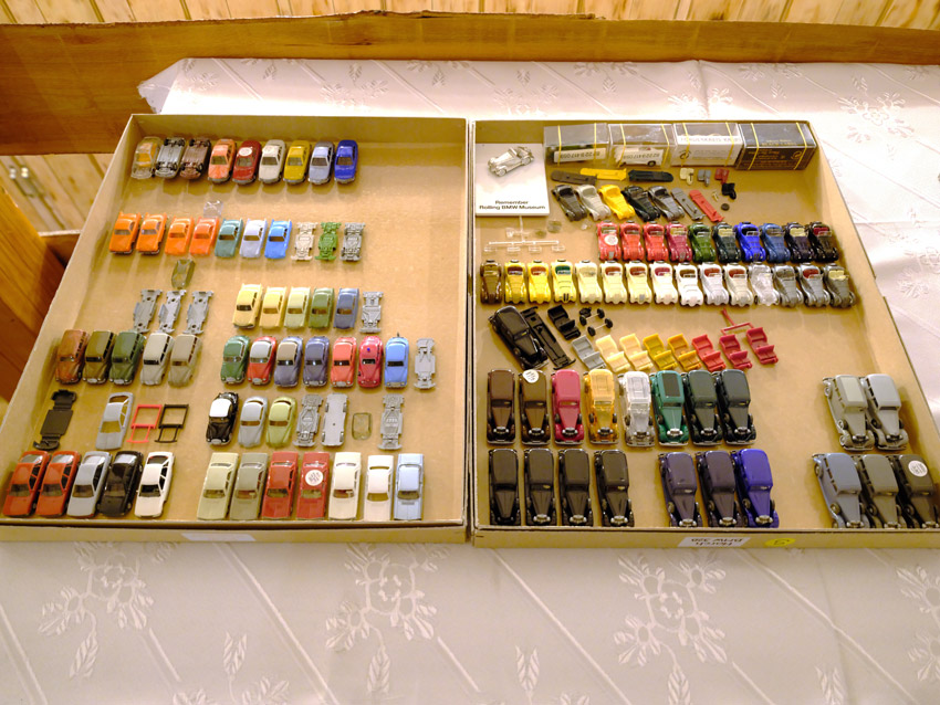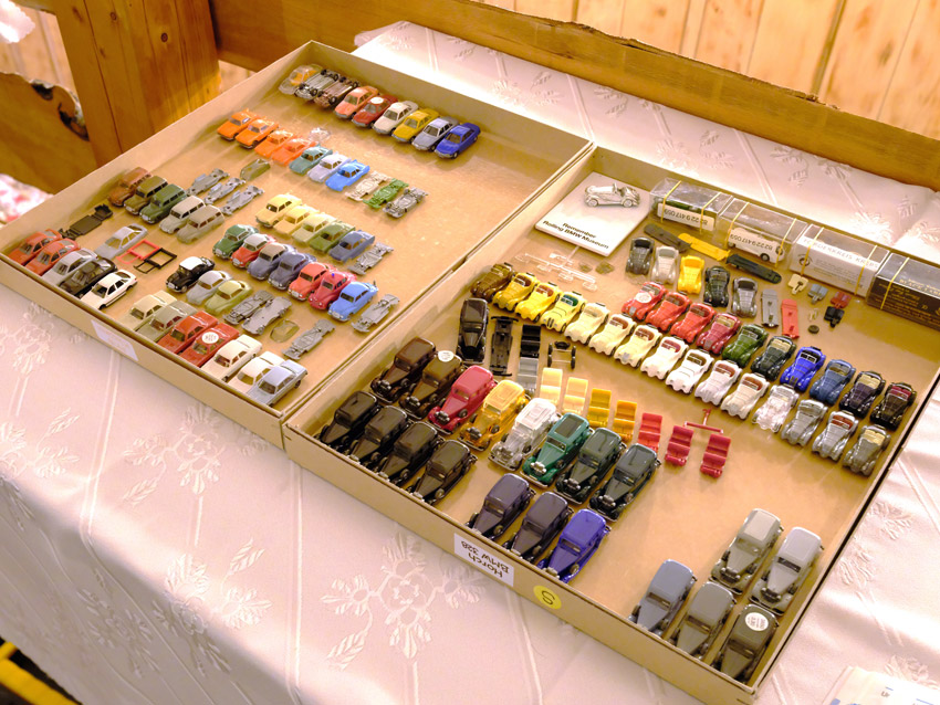 DKW: sowohl verglaste als auch unverglaste DKW-Exemplare wurden präsentiert: DKW Limousine und Coupe, DKW Junior, DKW F89, DKW Universal, der Geländewagen DKW-Munga, DKW Spezial. Auch hier waren einige wenige Blaulicht-Varianten vertreten. Ein Sammler hat wieder unverklebte Einzelteile von DKW-Modellen zusammengestellt. Bei den unverglasten Modellen hatten Sammler zahlreiche DKW Limousinen und Pritschenwagen in unterschiedlichsten Farben, mit und ohne Beladung mitgebracht. Zu beachten sind wieder die vollbestückten Händlerkartons #12a DKW-Junior, #12g Geländewagen, #12n DKW de Luxe und #36 DKW Pritschenwagen. Äußerst selten und nicht ganz günstig: DKW Coupe in babyblau mit Zughaken und DKW Limousine mit Zughaken in taubenblau. Ich hoffe, die Farbangaben stimmen.
