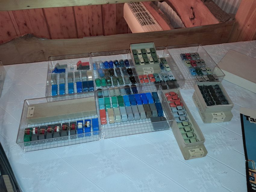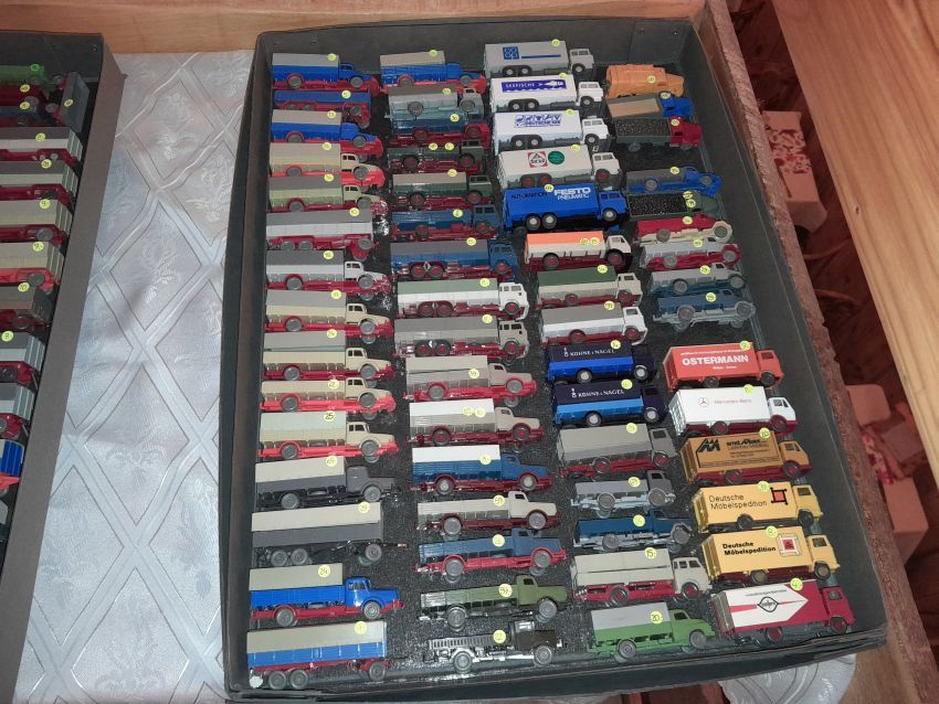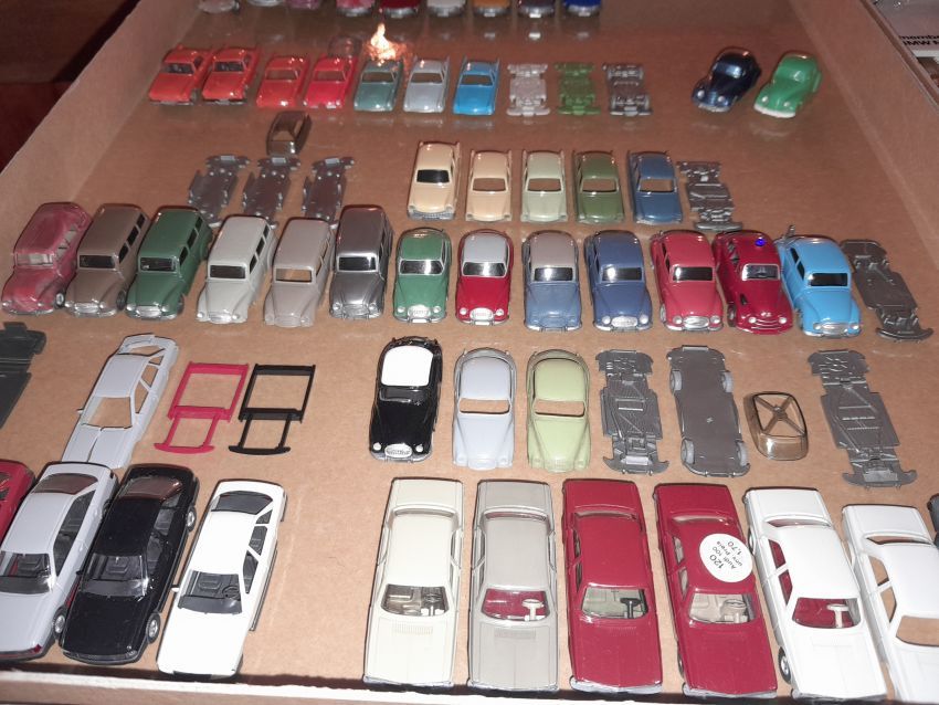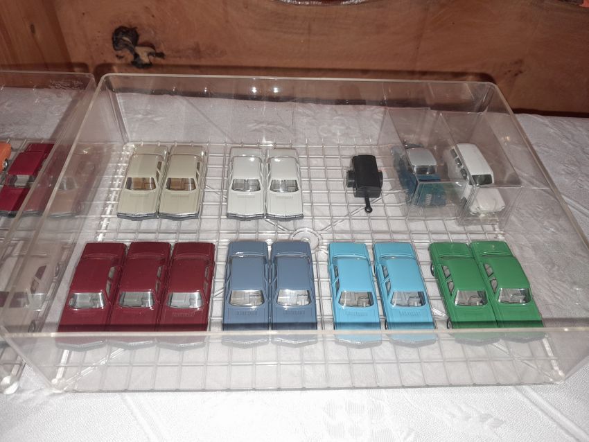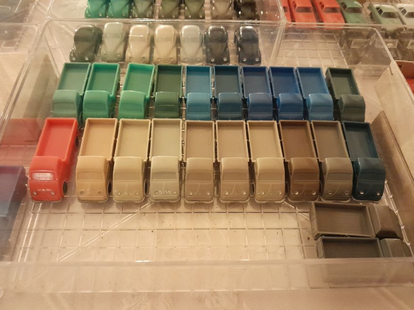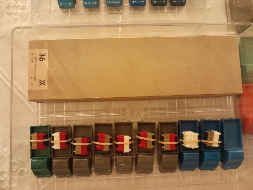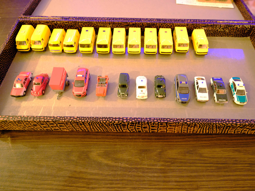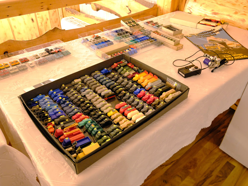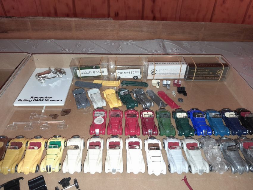 DKW: sowohl verglaste als auch unverglaste DKW-Exemplare wurden präsentiert: DKW Limousine und Coupe, DKW Junior, DKW F89, DKW Universal, der Geländewagen DKW-Munga, DKW Spezial. Auch hier waren einige wenige Blaulicht-Varianten vertreten. Ein Sammler hat wieder unverklebte Einzelteile von DKW-Modellen zusammengestellt. Bei den unverglasten Modellen hatten Sammler zahlreiche DKW Limousinen und Pritschenwagen in unterschiedlichsten Farben, mit und ohne Beladung mitgebracht. Zu beachten sind wieder die vollbestückten Händlerkartons #12a DKW-Junior, #12g Geländewagen, #12n DKW de Luxe und #36 DKW Pritschenwagen. Äußerst selten und nicht ganz günstig: DKW Coupe in babyblau mit Zughaken und DKW Limousine mit Zughaken in taubenblau. Ich hoffe, die Farbangaben stimmen.