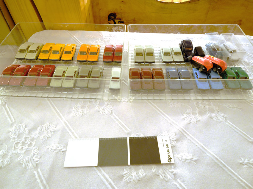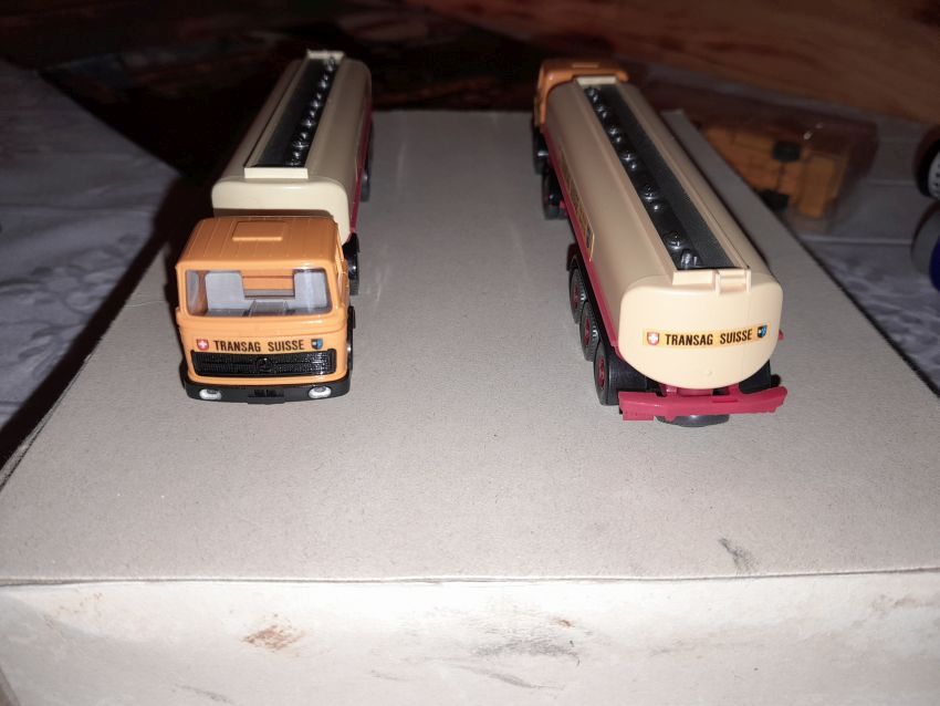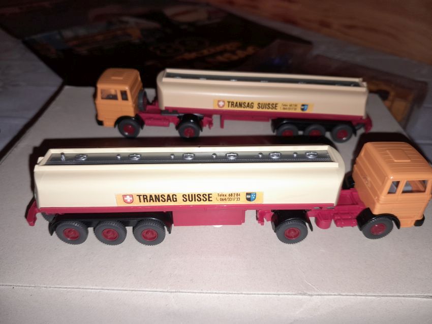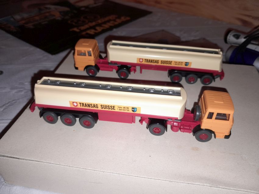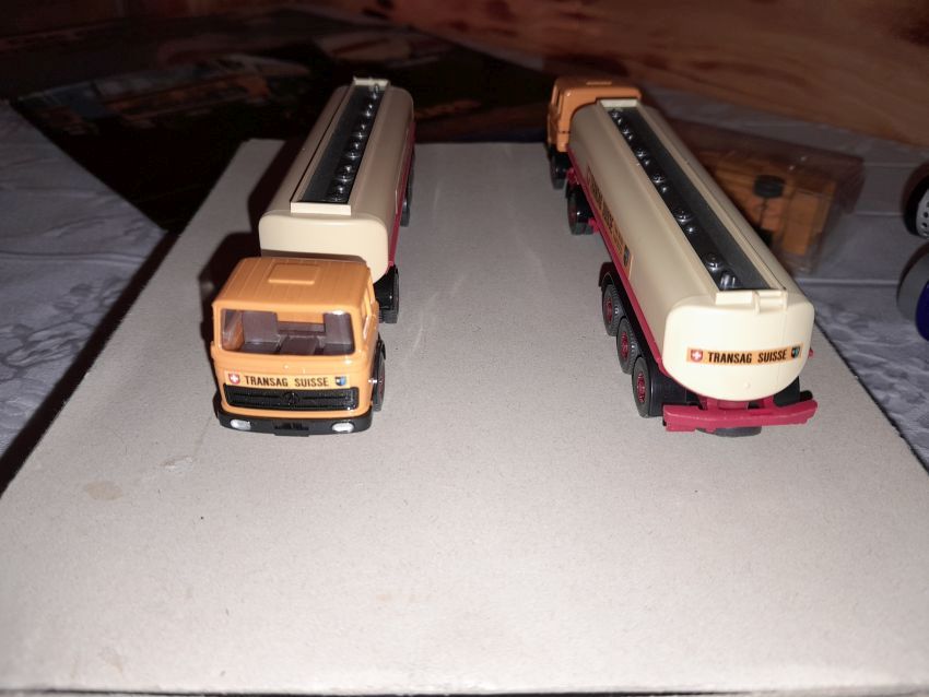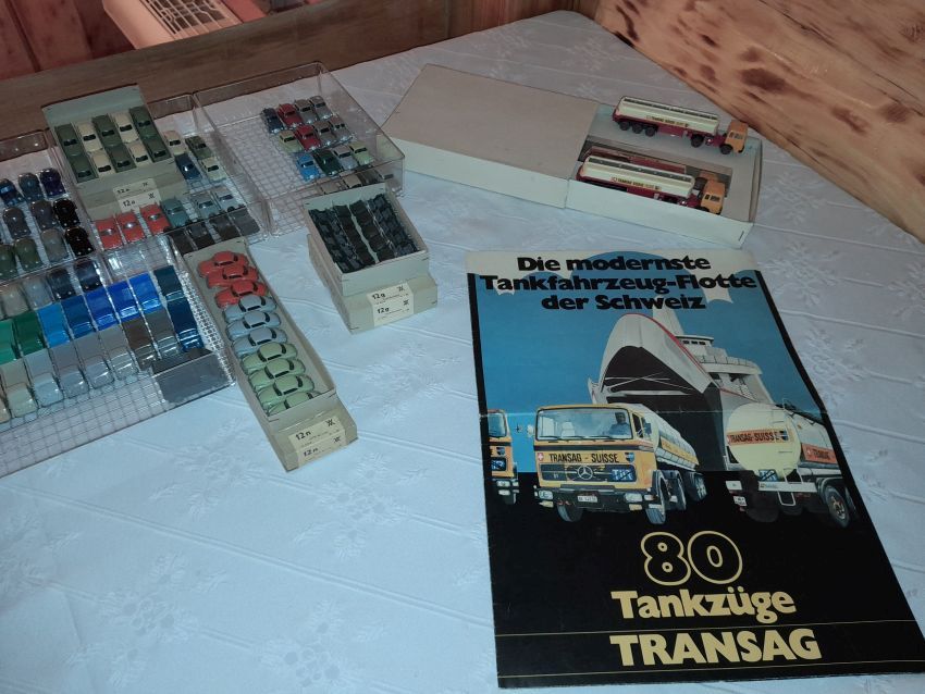 Jetzt kommen wir zu den Modellen, die nicht zum Themen-Schwerpunkt des heutigen Sammlerabends gehören: Unser 1:40er Sammler hat unter dem Thema Edel-Brennstoff, 1. Käfer Club Wolfsburg e.V., einige sehr seltene transparente Käfer und VW T1 Bus Modelle ausgestellt. Als besonderes Highlight ist sicher der transparente Käfer im Masstab 1:19 aus portugiesischer Produktion zu nennen. Natürlich haben sich auch diverse NSU Ro 80 Modelle aus Wiking Produktion auf den Tischen eingefunden. Zwei schöne Audi 100 Limousinen in 1:43 hatten sich auch nach Heinde verfahren. Ein weißes und ein rotes Modell mit einer neutralen silberfarbenen Verpackung mit technischen Daten zum Vorbild. In der Horch-Präsentation unseres Sammlers befinden sich neben den Horch Limousinen auch BMW 328 Modelle in Einzelteilen, entsprechende BMW-Sondermodelle und ein verchromtes Modell mit Handbuch Remember Rolling BMW Museum. Und dann war da noch die modernste Tankfahrzeug-Flotte der Schweiz: 80 Tankzüge TRANSAG. Zwei von den 80 Tanksattelzügen hat der Sammler ausgestellt. Die Modelle laut Saure aus dem Jahr 1973 unterscheiden sich in der Farbe der Inneneinrichtung und der Klemmplatte am Auflieger. Ein Sattelzug hat ein Reserverad hinter dem Führerhaus. Die Tankauflieger verfügen über keine Aufstiegsleiter am Heck.