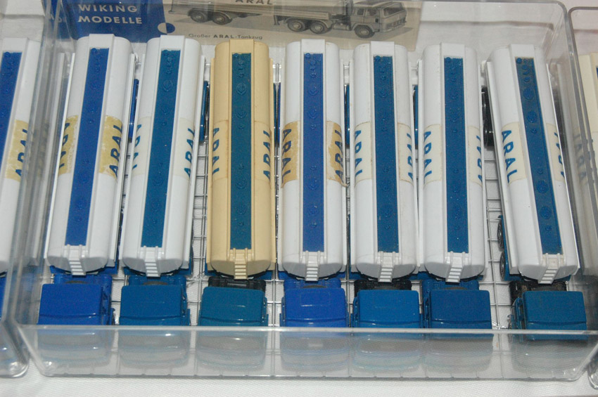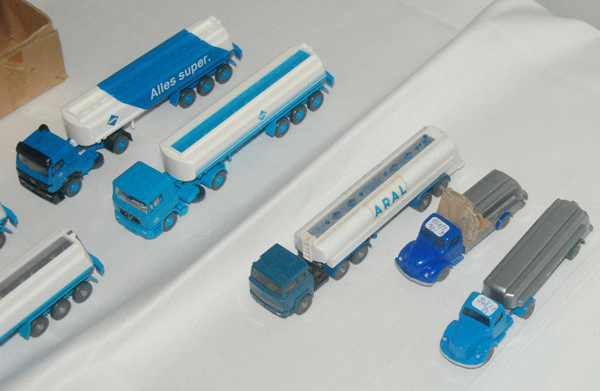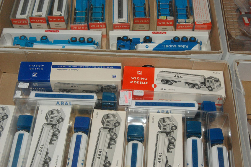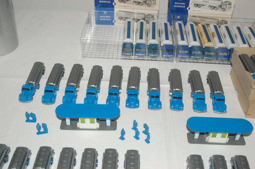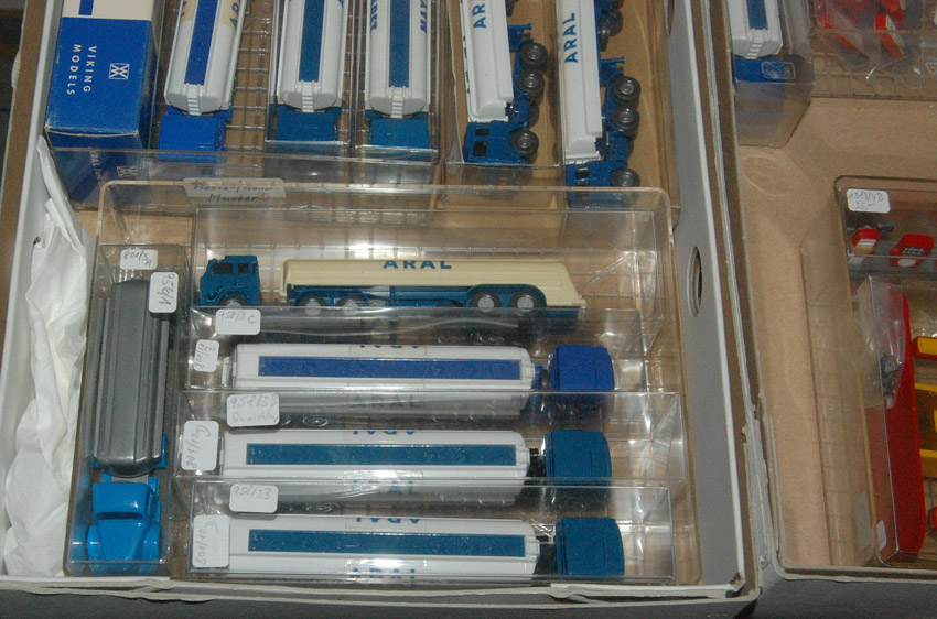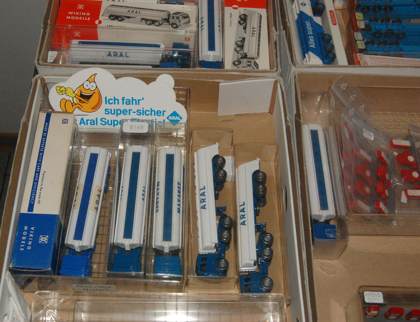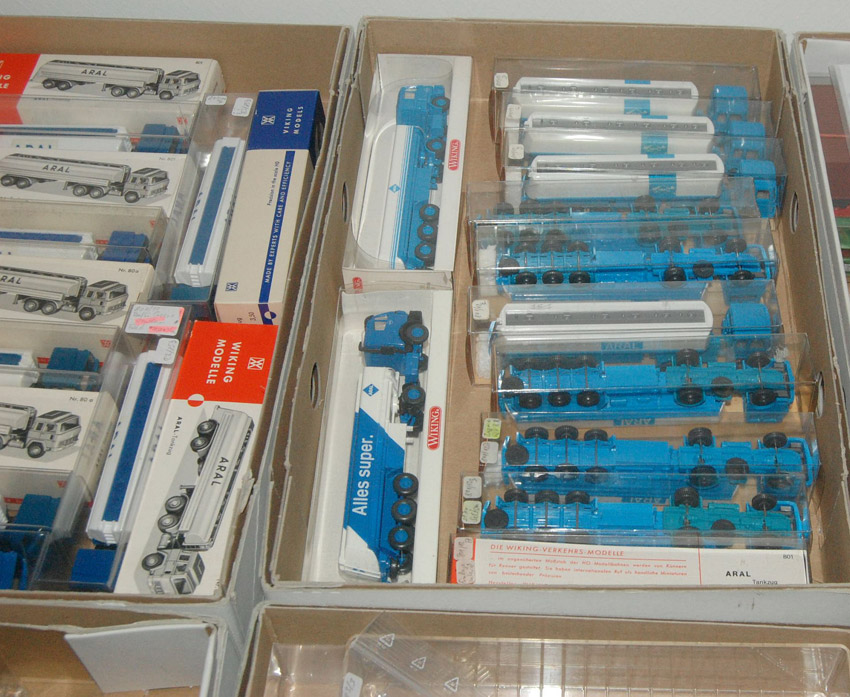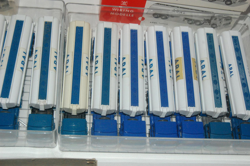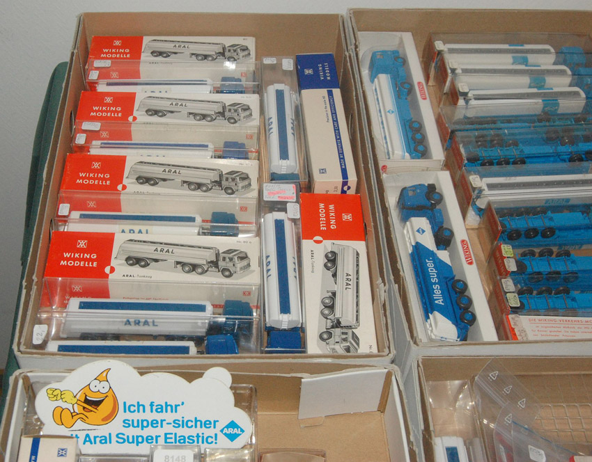 Ein regelmäßiger Teilnehmer unseres Stammtisches hatte dieses Mal in den Vor-Harz als seine Heimat geladen. Man traf sich also im Gasthof A.Zwickert, 37589 Kalefeld-Oldenrode. Wer in die Gegend kommt - unbedingt sowohl von der Qualität als auch bezüglich des Preis-/Leistungsverhältnisses sehr zu empfehlen http://www.gasthaus-zwickert.de. Groß war die Überraschung der insgesamt 10 Teilnehmer, als der Initiator schließlich darauf bestand, nicht nur die Rechnung für die Getränke, sondern auch für die zahlreich verzehrten leckeren Speisen zu übernehmen. Dafür an dieser Stelle nochmal besonderen Dank im Namen aller Teilnehmer! Eigentlich waren als Thema des Tages alle Wiking-Objekte vorgesehen, die Bezug zur Firma ARAL haben - sowohl Fahrzeuge als auch Tankstellen und anderes Zubehör. Wie sich zeigte, ein durchaus überschaubares Thema, auch wenn es gerade vom "Großen ARAL-Tankzug (WM 80a)" mit Magirus Zugmaschine diverse Varianten zu sehen gab. Der legendäre Drahtrachser-Tankwagen, der es nie in eine Wiking-Preisliste geschafft hat - jüngst noch auf dem Sammlertreffen in Vlotho zu bestaunen - war diesmal mangels Masse leider nicht dabei ;o)). Ganz kurzfristig wurde noch von einigen anwesenden Sammlern ein Abgleich verschiedener Details der klassischen Büssing 8000 Pritschen-Lkw (WM 47s/478) vereinbart, von dem dann zusätzlich eine nicht unerhebliche Zahl in den unterschiedlichsten Varianten zu bestaunen waren.