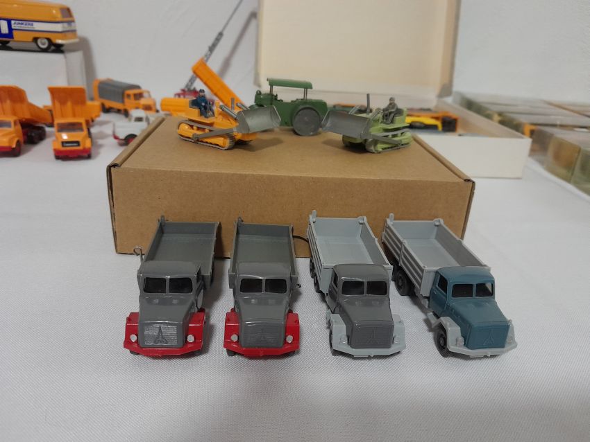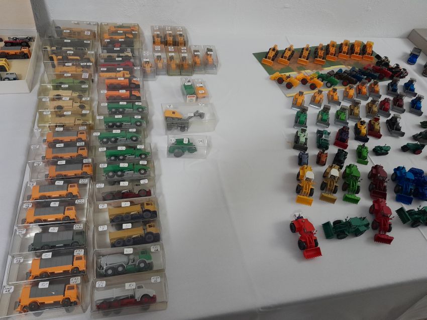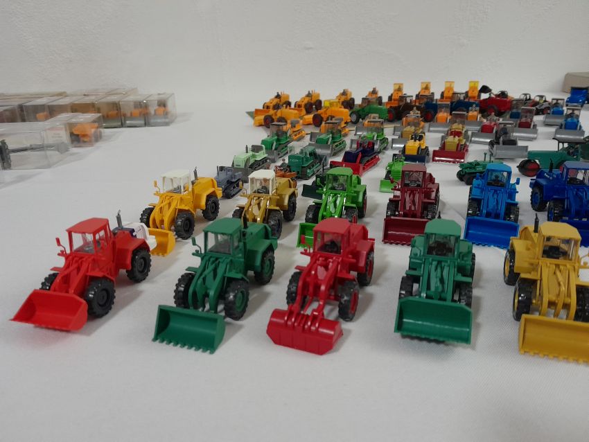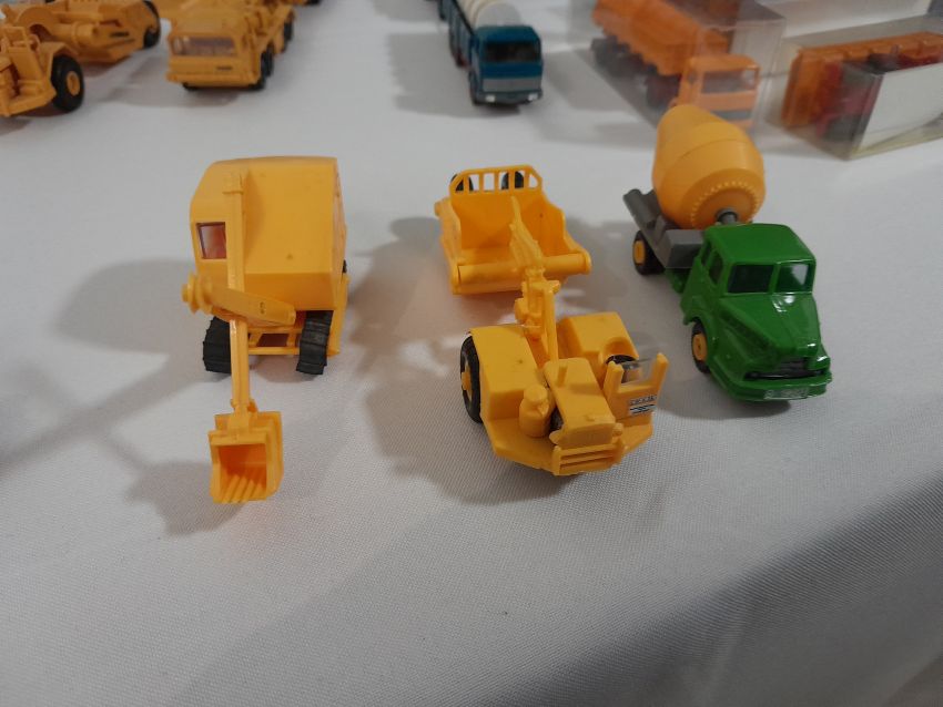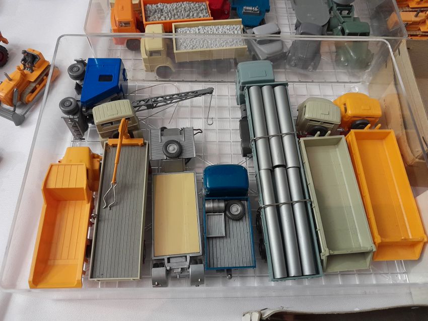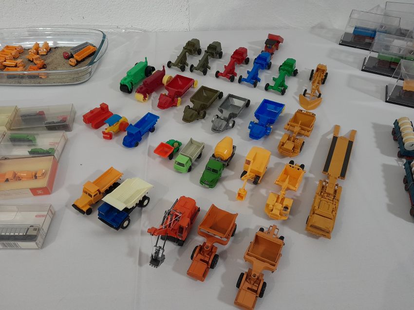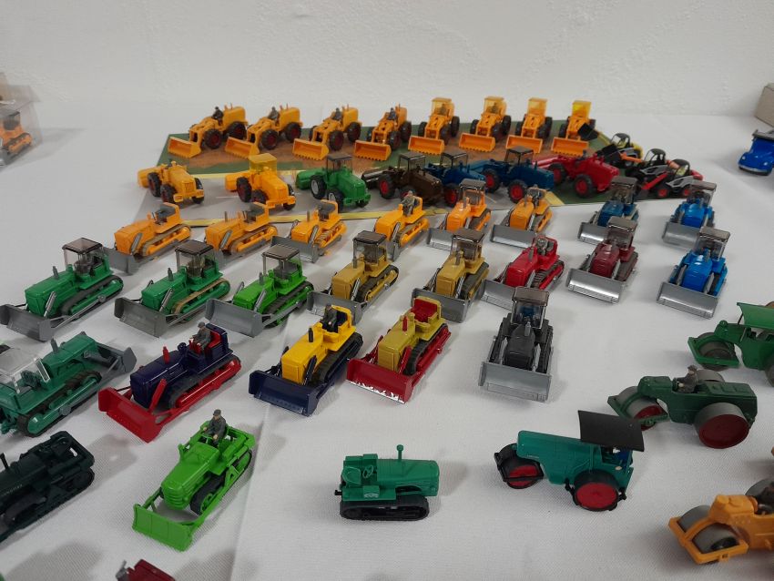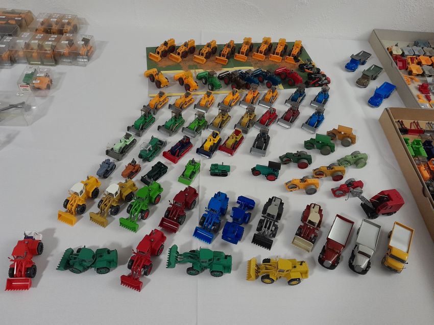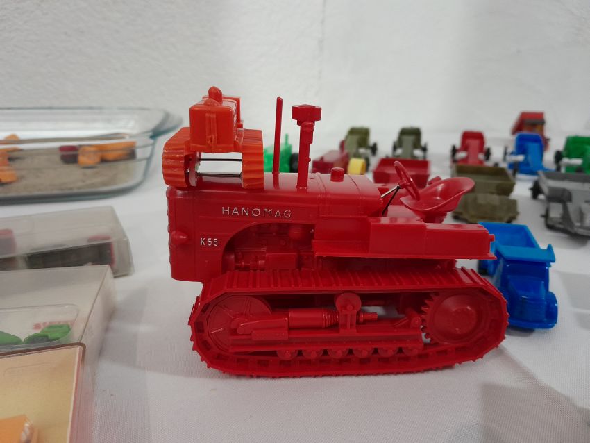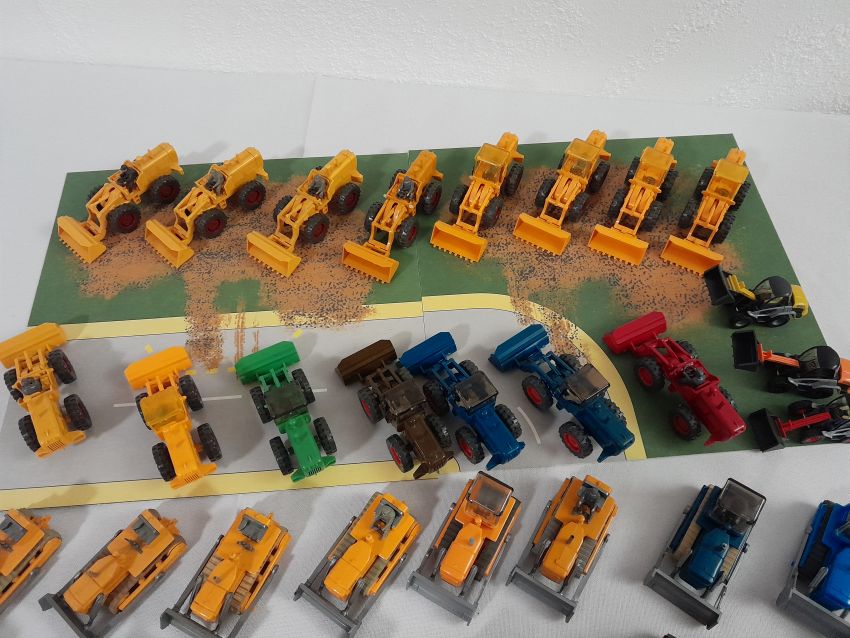Und natürlich hatten einige Sammler wieder diverse Fremdfabrikate im Gepäck, die mit ihrer bunten Farbgebung herausstachen. Die Modelle sind aus DDR-Produktion (5 Modelle), Eko aus Spanien (3 Modelle), Hongkong-Matchbox Kopien (Frontkipper u. Lkw), Manurba (Hanomag Raupe, Walze und Muldenkipper), Banner U.S.A. (Erdbeweger, Walzen und Grader) und Umex (Scraper und Grader) im Roco Vertrieb. Der Panzertransporter ist von Roco.
