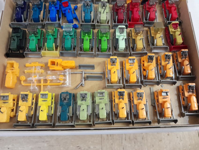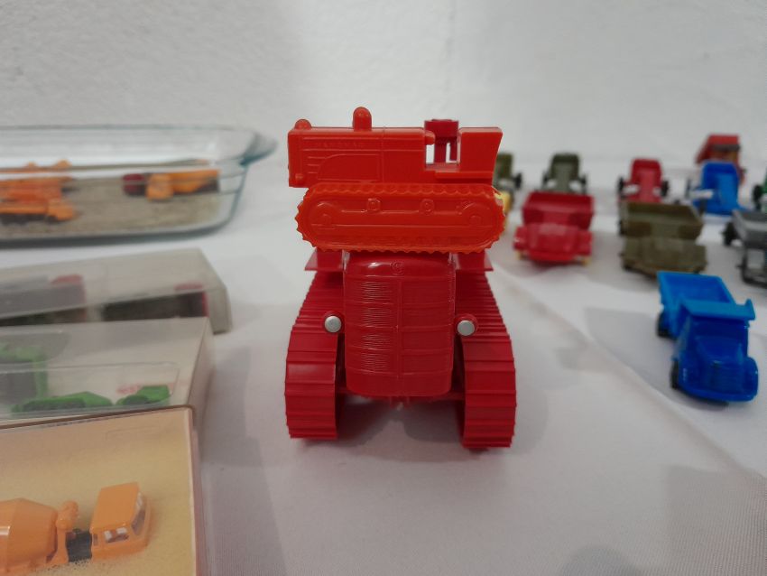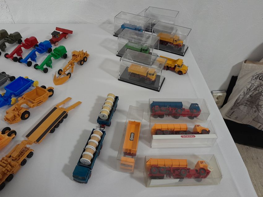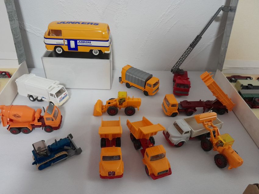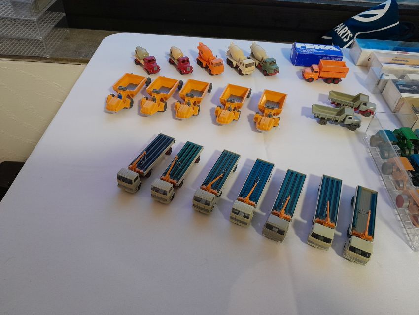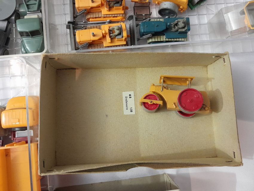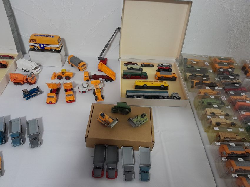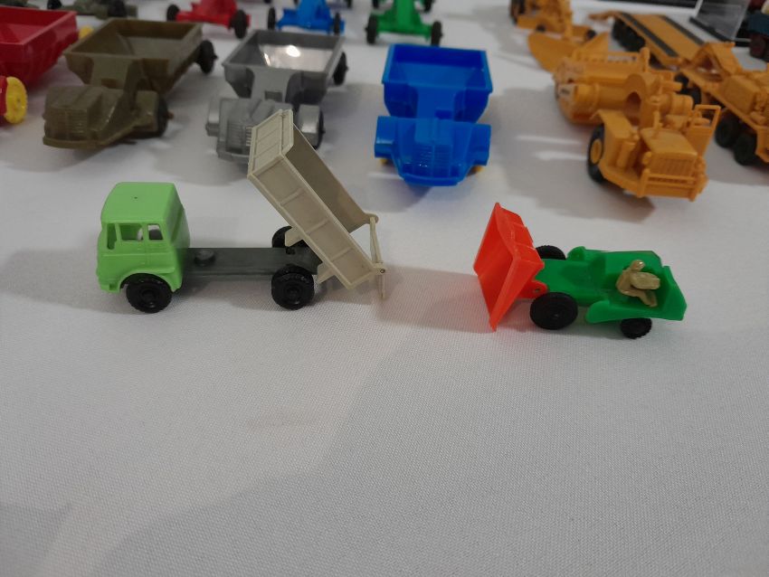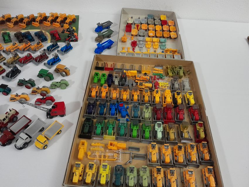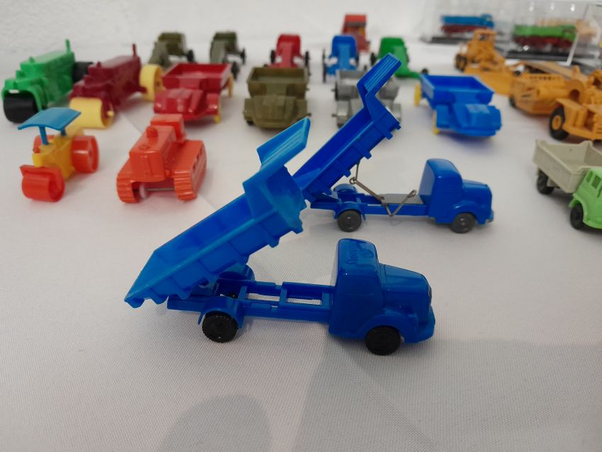 Und natürlich hatten einige Sammler wieder diverse Fremdfabrikate im Gepäck, die mit ihrer bunten Farbgebung herausstachen. Die Modelle sind aus DDR-Produktion (5 Modelle), Eko aus Spanien (3 Modelle), Hongkong-Matchbox Kopien (Frontkipper u. Lkw), Manurba (Hanomag Raupe, Walze und Muldenkipper), Banner U.S.A. (Erdbeweger, Walzen und Grader) und Umex (Scraper und Grader) im Roco Vertrieb. Der Panzertransporter ist von Roco.