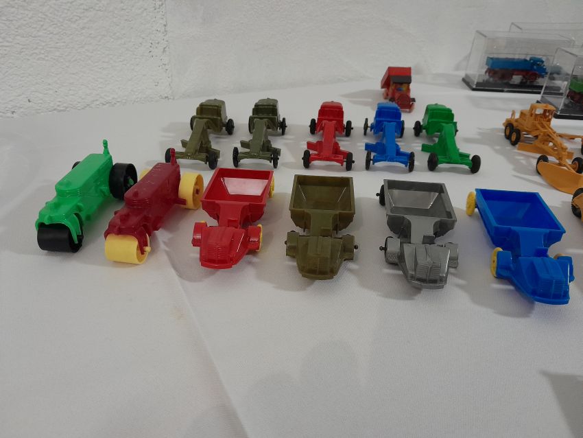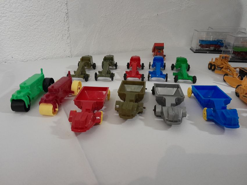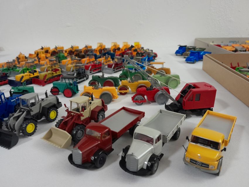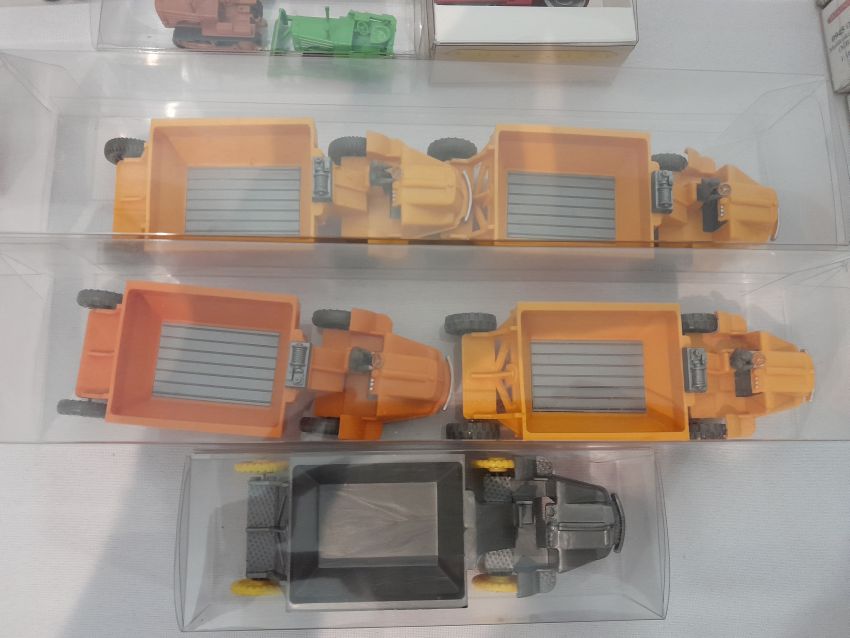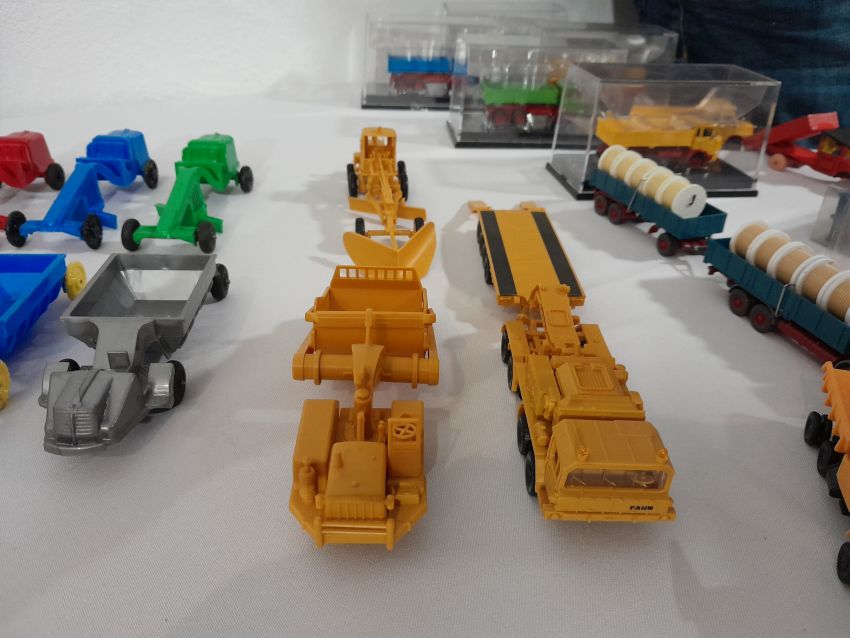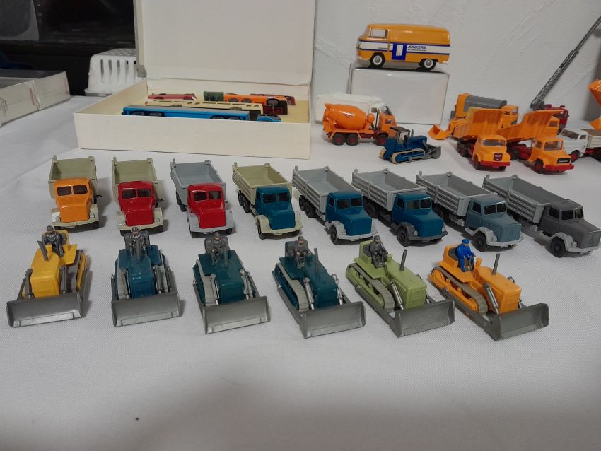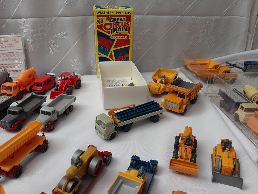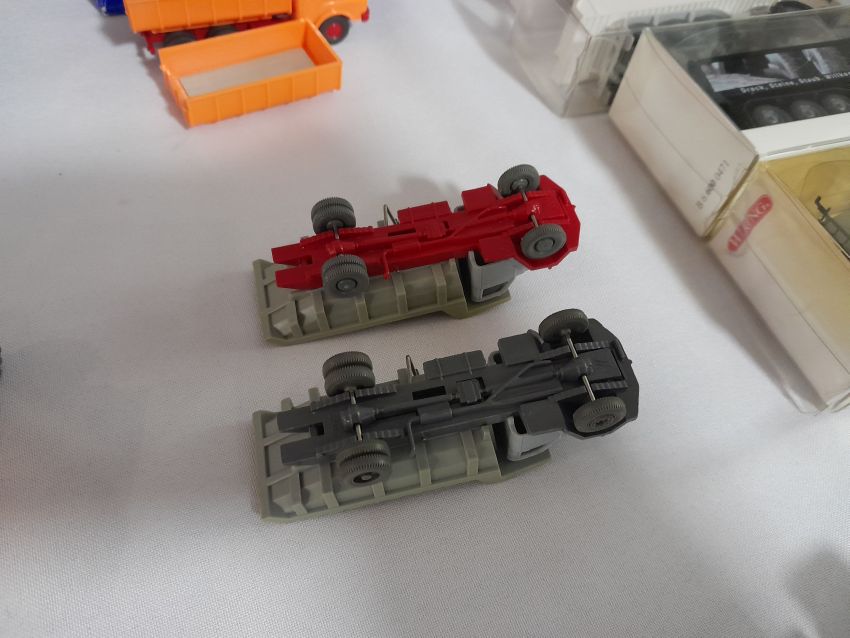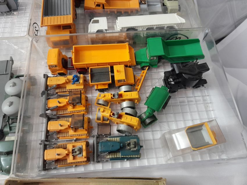 Und natürlich hatten einige Sammler wieder diverse Fremdfabrikate im Gepäck, die mit ihrer bunten Farbgebung herausstachen. Die Modelle sind aus DDR-Produktion (5 Modelle), Eko aus Spanien (3 Modelle), Hongkong-Matchbox Kopien (Frontkipper u. Lkw), Manurba (Hanomag Raupe, Walze und Muldenkipper), Banner U.S.A. (Erdbeweger, Walzen und Grader) und Umex (Scraper und Grader) im Roco Vertrieb. Der Panzertransporter ist von Roco.