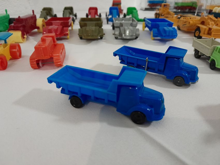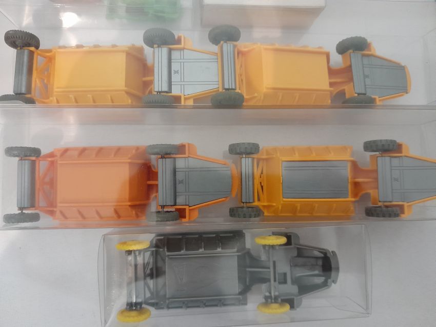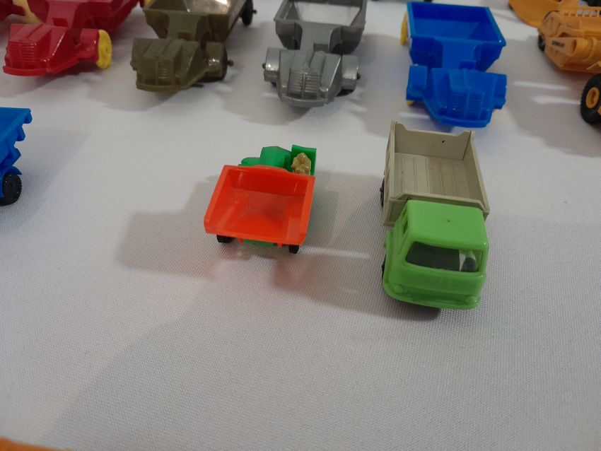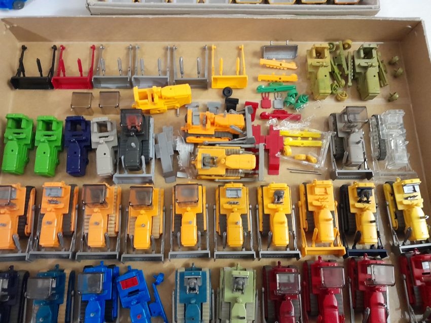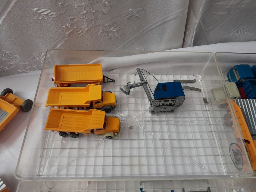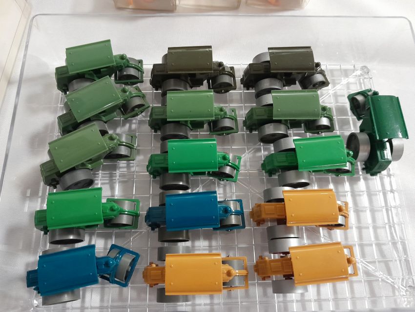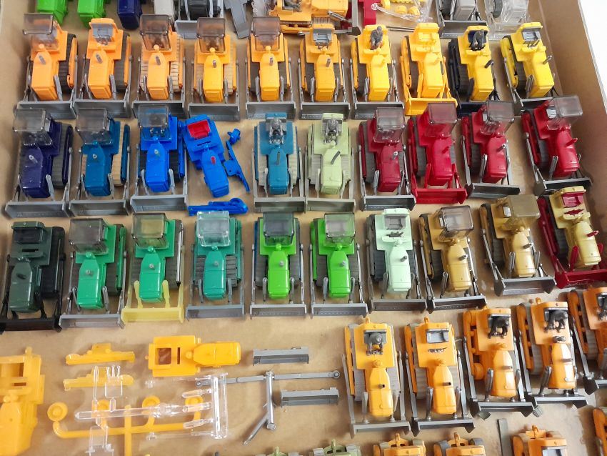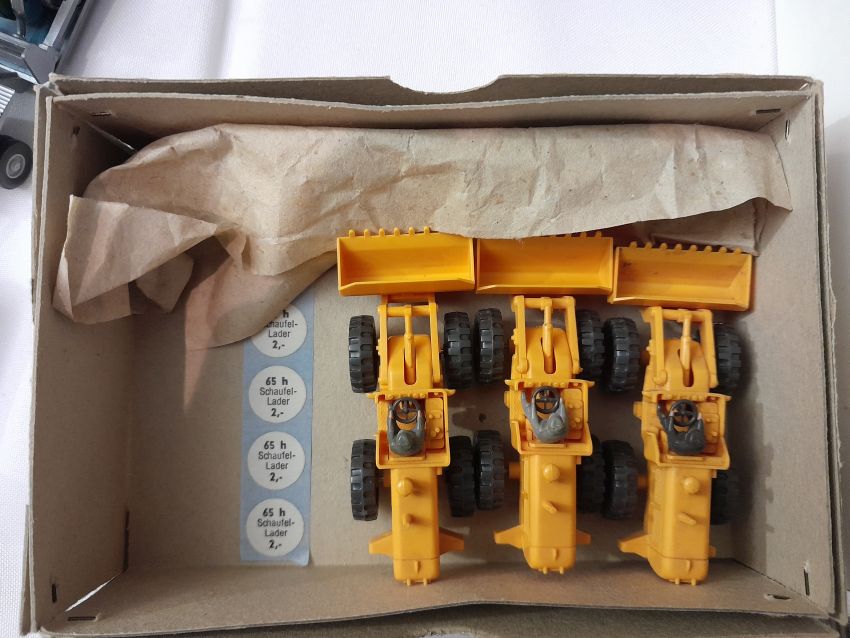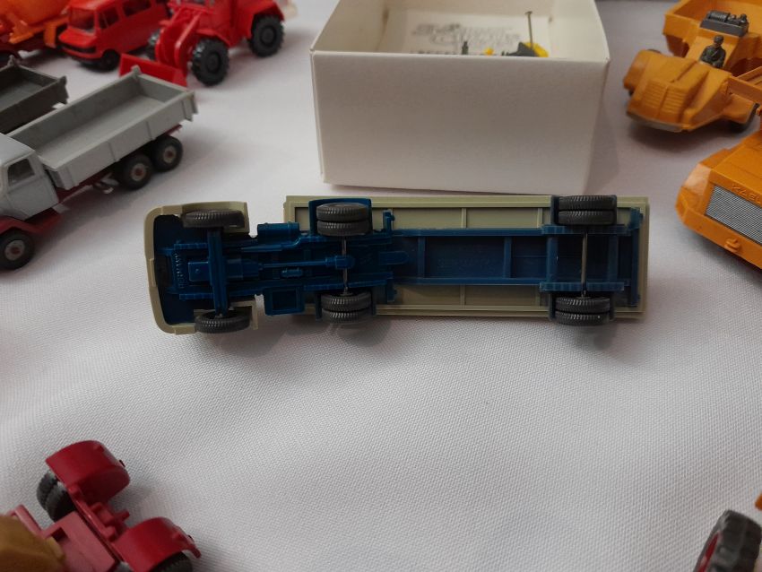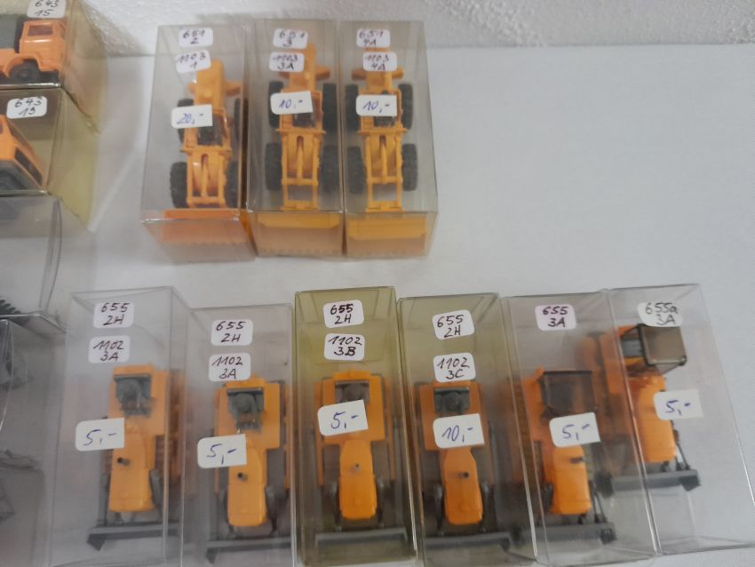 Und natürlich hatten einige Sammler wieder diverse Fremdfabrikate im Gepäck, die mit ihrer bunten Farbgebung herausstachen. Die Modelle sind aus DDR-Produktion (5 Modelle), Eko aus Spanien (3 Modelle), Hongkong-Matchbox Kopien (Frontkipper u. Lkw), Manurba (Hanomag Raupe, Walze und Muldenkipper), Banner U.S.A. (Erdbeweger, Walzen und Grader) und Umex (Scraper und Grader) im Roco Vertrieb. Der Panzertransporter ist von Roco.
