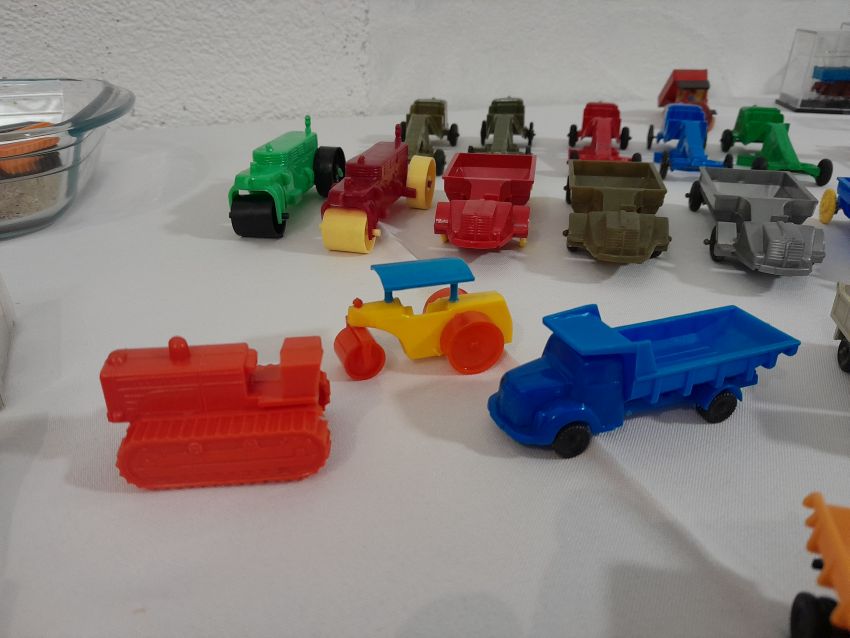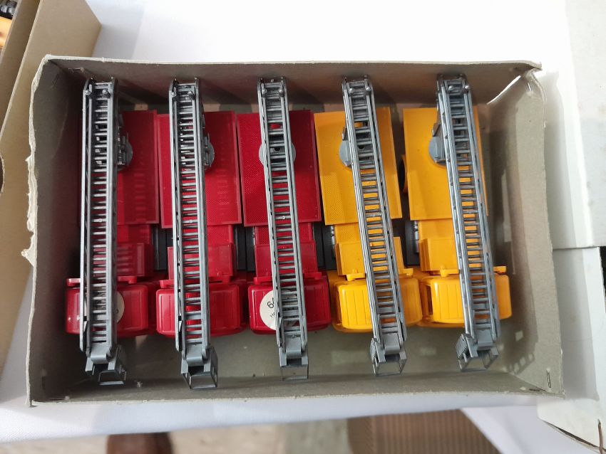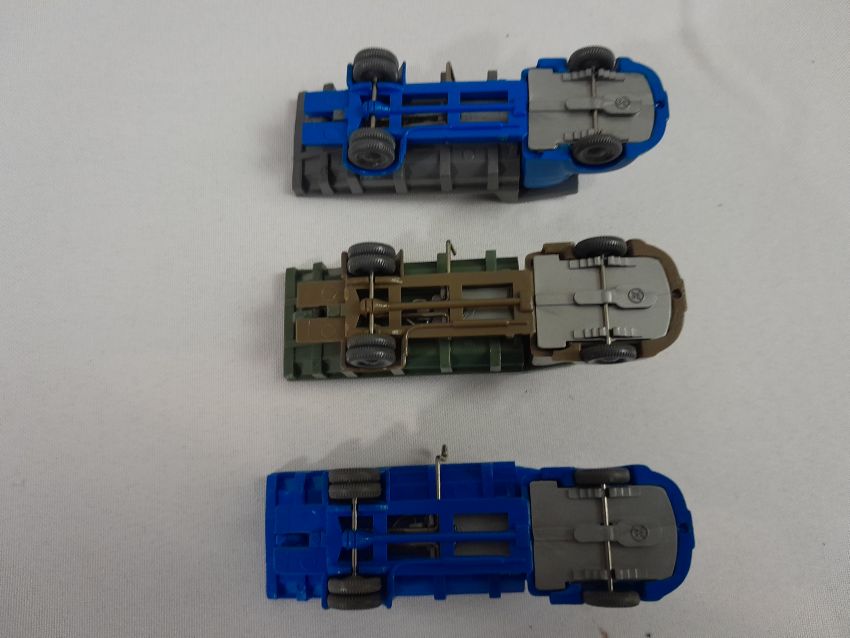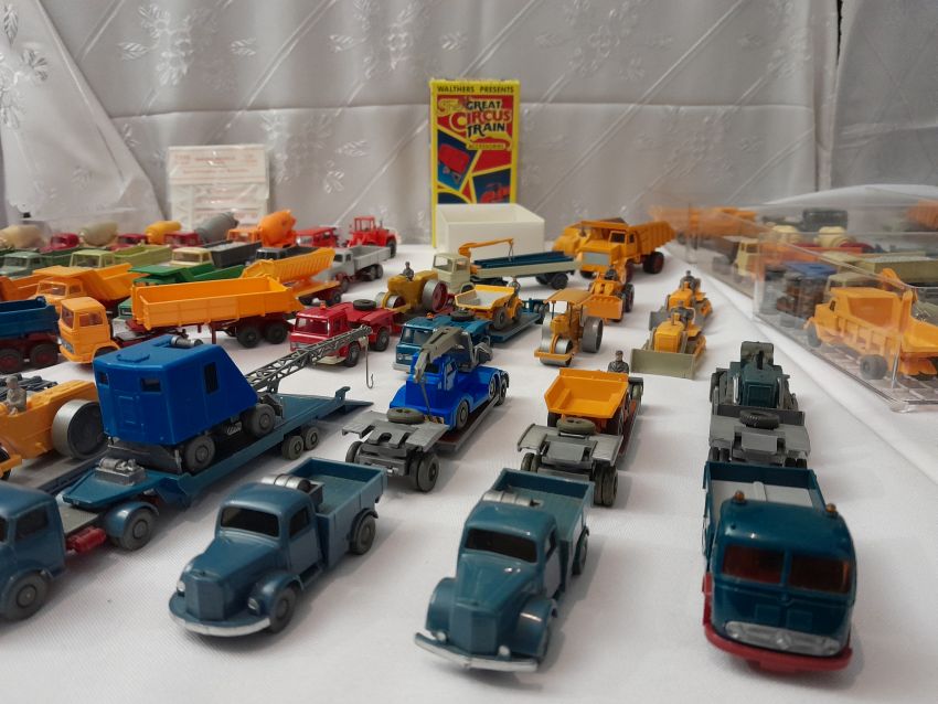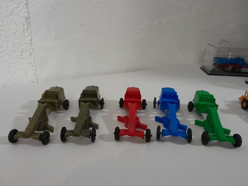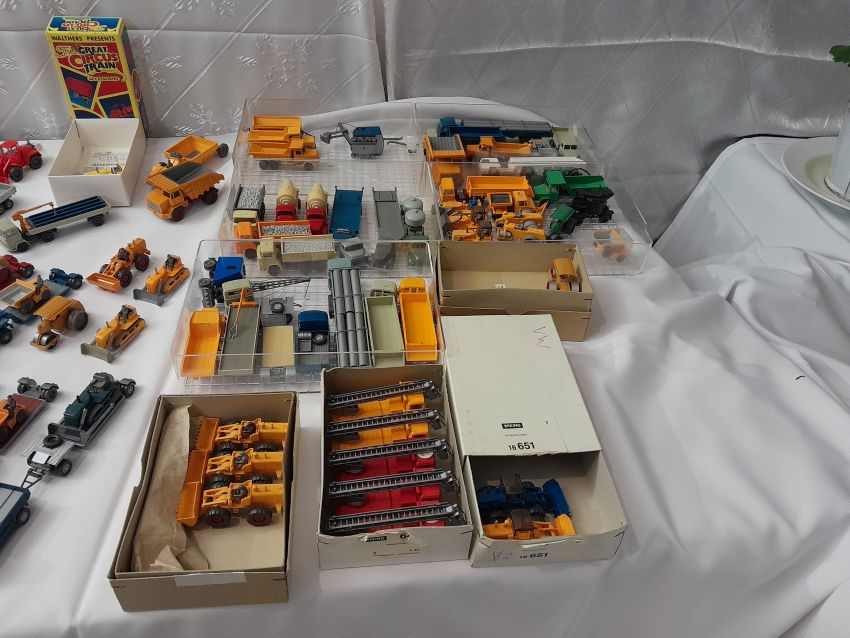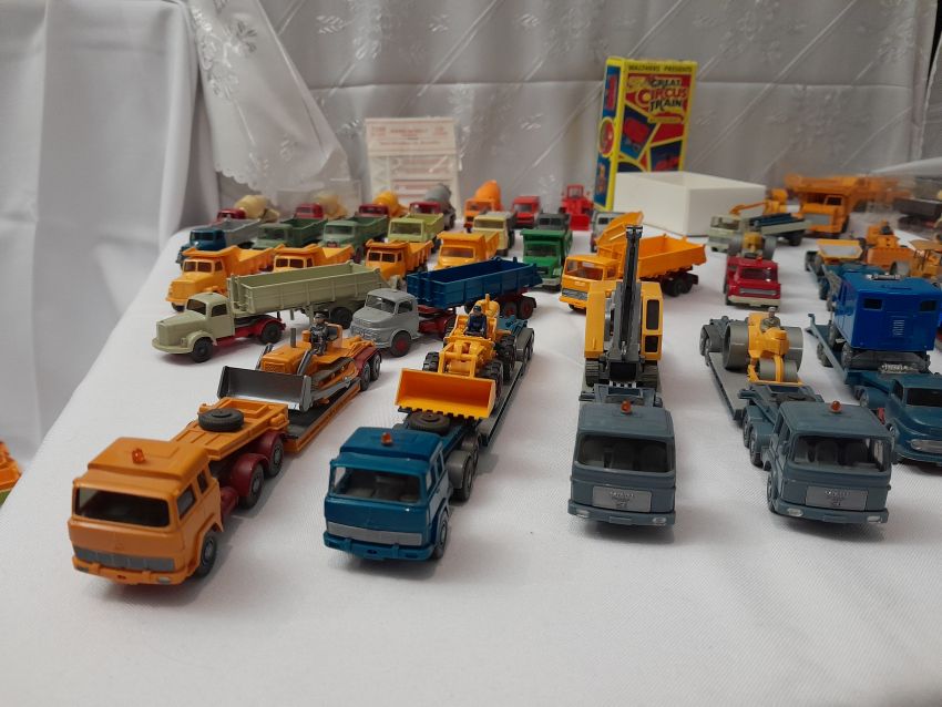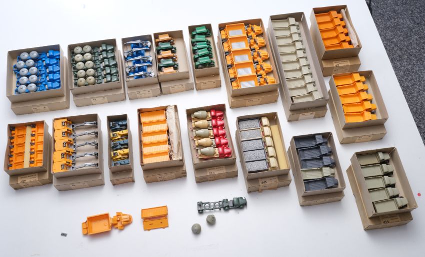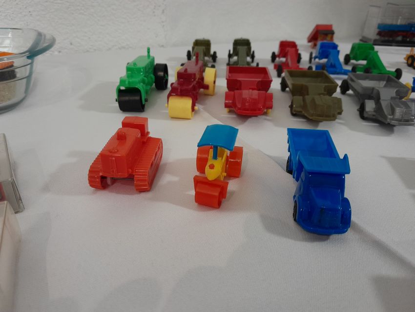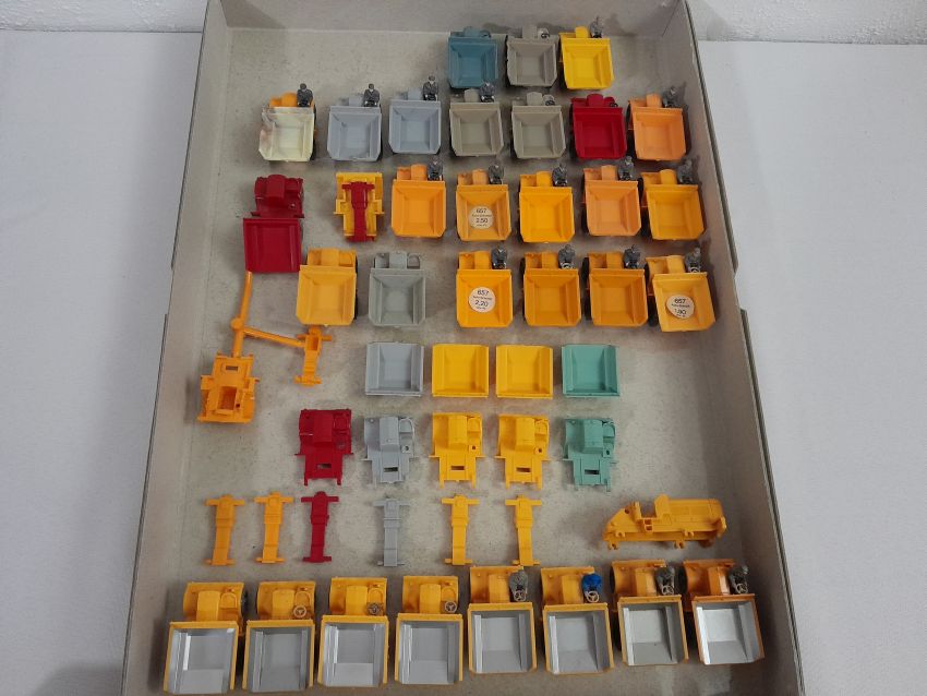 Und natürlich hatten einige Sammler wieder diverse Fremdfabrikate im Gepäck, die mit ihrer bunten Farbgebung herausstachen. Die Modelle sind aus DDR-Produktion (5 Modelle), Eko aus Spanien (3 Modelle), Hongkong-Matchbox Kopien (Frontkipper u. Lkw), Manurba (Hanomag Raupe, Walze und Muldenkipper), Banner U.S.A. (Erdbeweger, Walzen und Grader) und Umex (Scraper und Grader) im Roco Vertrieb. Der Panzertransporter ist von Roco.
