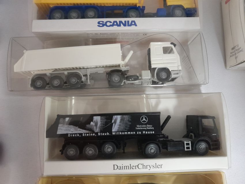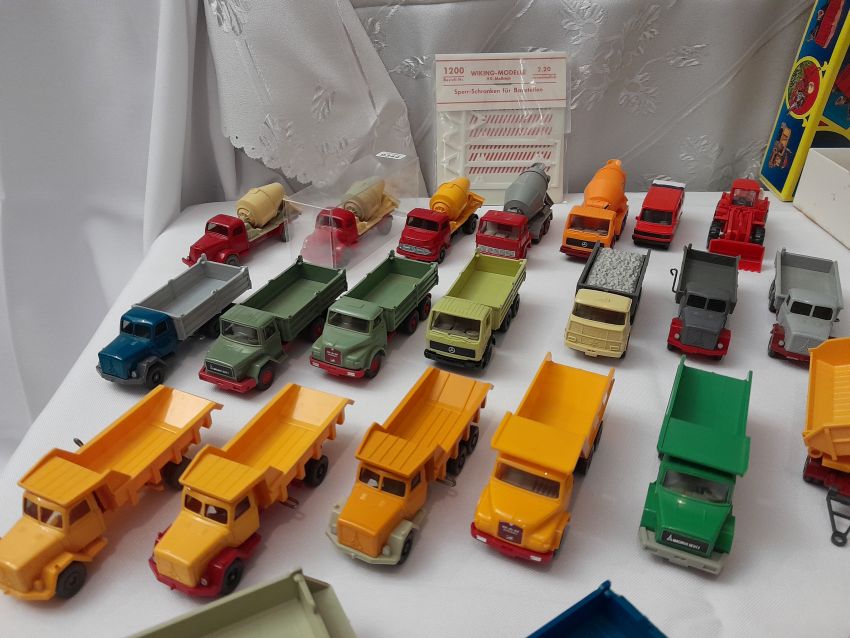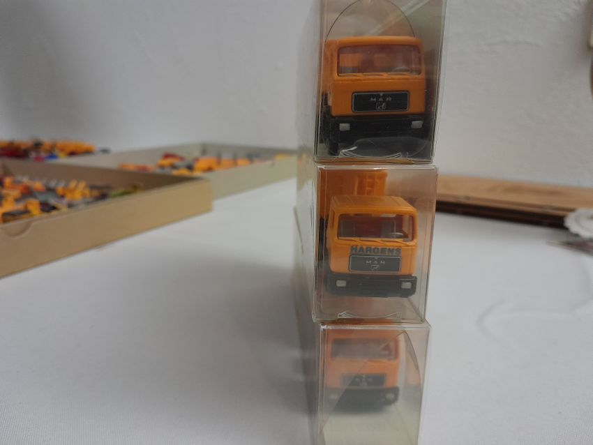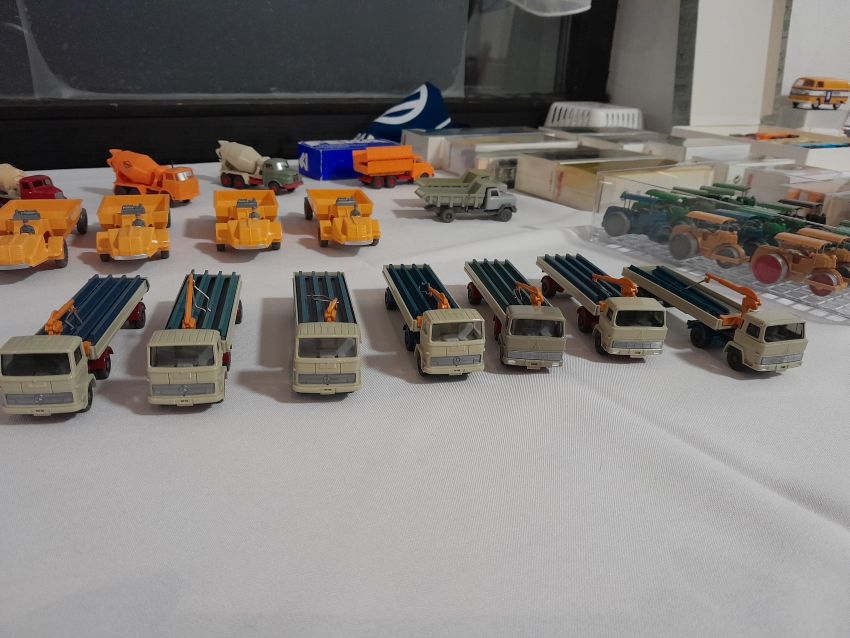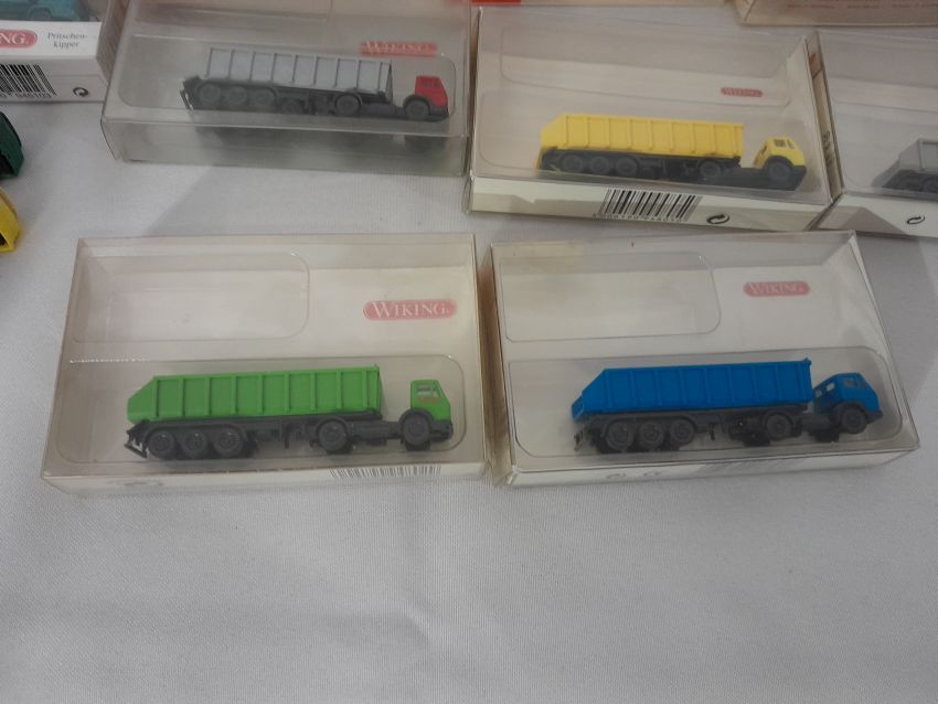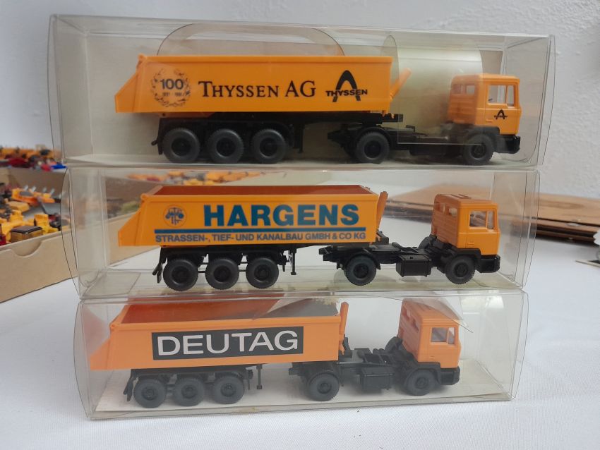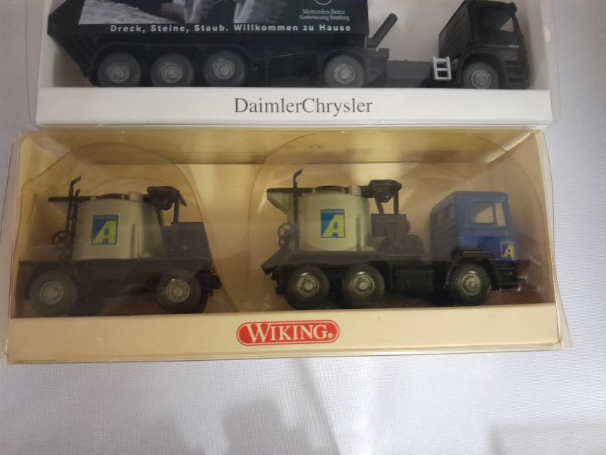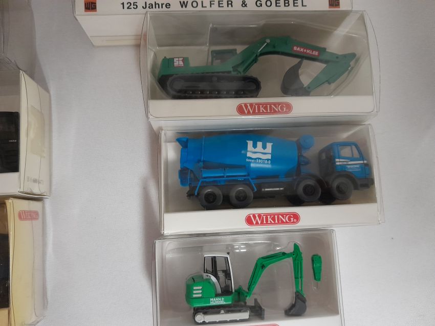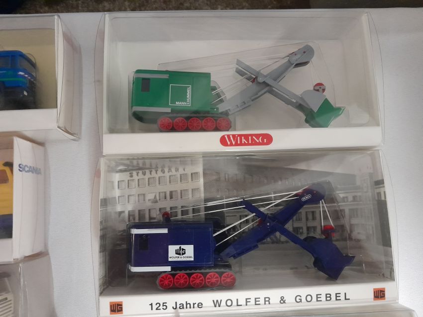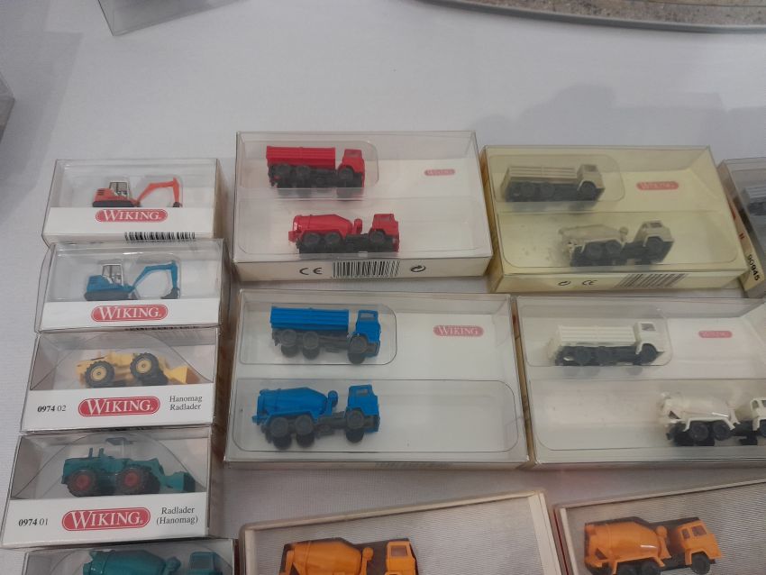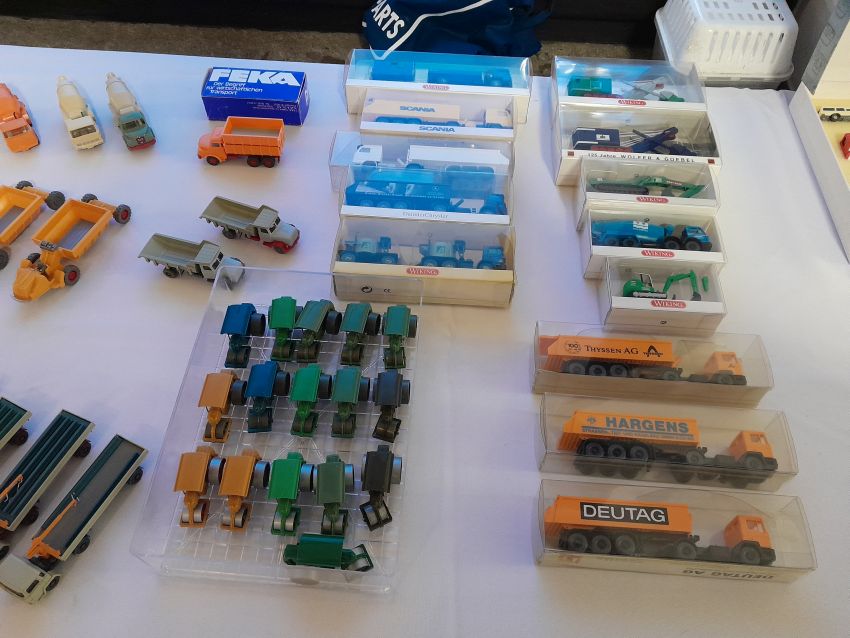 An Wiking Baufahrzeugen war alles vertreten, was das Sortiment hergibt. Lediglich der Menck Bagger im grossen Masstab war nicht dabei. Lutz hatte für seine N-Modelle einen Sandkasten mitgebracht, in dem die ganze Zeit gebaggert wurde. Es wurden wieder zahlreiche Werbe- und Sondermodelle mitgebracht, seltene Farbkombinationen waren zu bestaunen und auch wieder Modelle in Einzelteilen. Die Anzahl der ausgestellten Modelle ging in die Hunderte, was auch die vielen Bilder erklärt. Nehmt euch viel Zeit, um die Bilder ausgiebig zu betrachten. Einige Besonderheiten seien erwähnt: Henschel Readymix Betonmischer - im GK 2002 als Werbemodell, im GK 2003 als unbesetzt gelistet. Die 2-achsigen Magirus Muldenkipper sind seltene Farbkombinationen, die Baustoffwagen waren mit MB und Magirus Zugmaschinen vertreten, die sich mit unterschiedlich getönten Verglasungen und Chassis-Farbgebungen unterscheiden. Die Modelle in den Original-Verpackungen (drittletztes Bild) waren leider nicht vor Ort, da der Sammler kurzfristig aus privaten Gründen abgesagt hat. Ich wollte euch dieses Bild nicht vorenthalten.