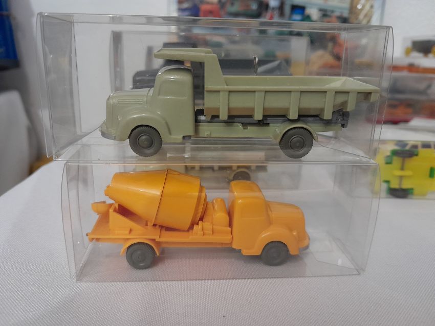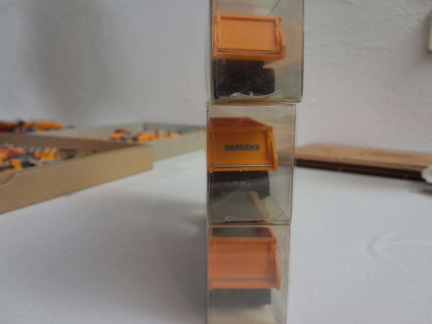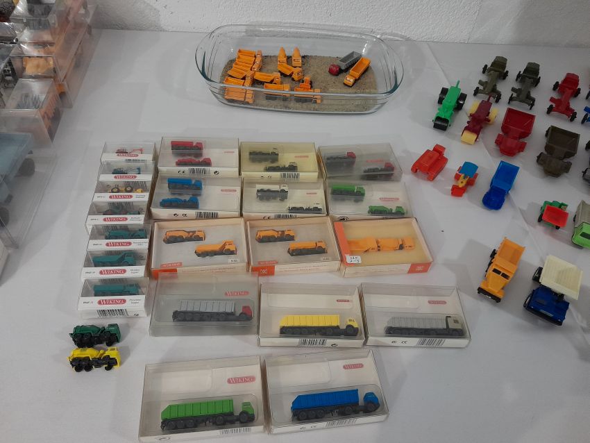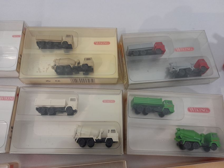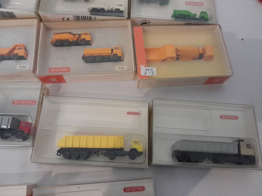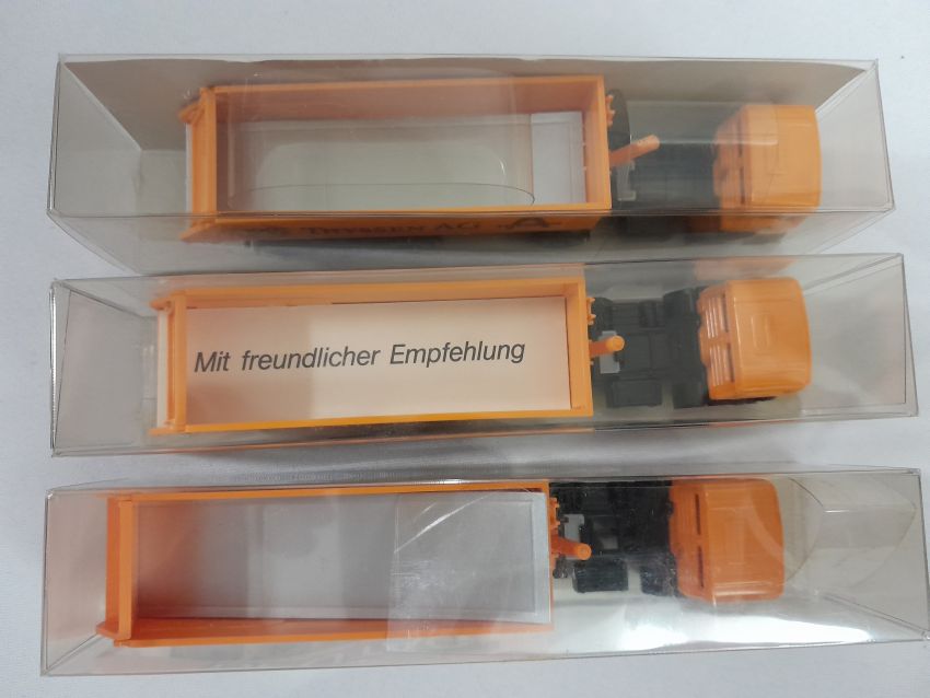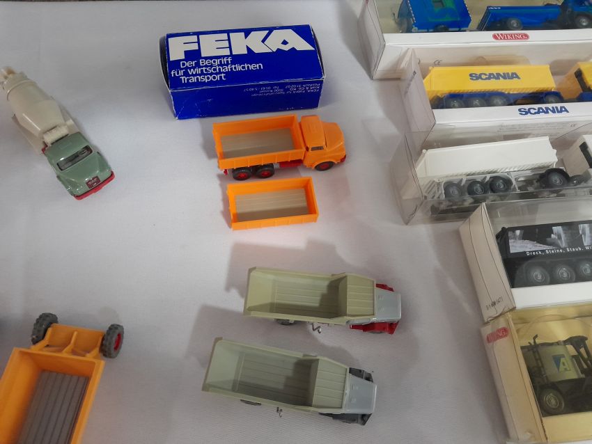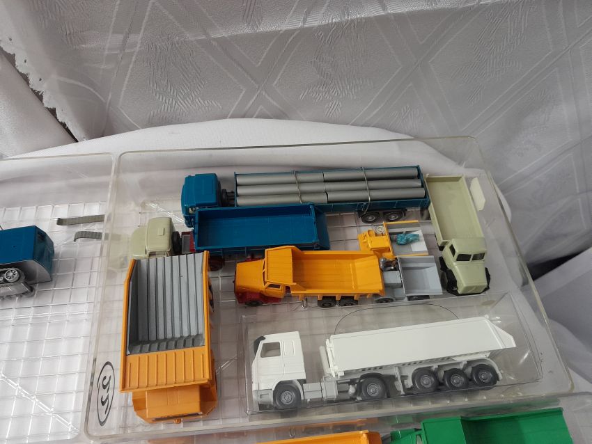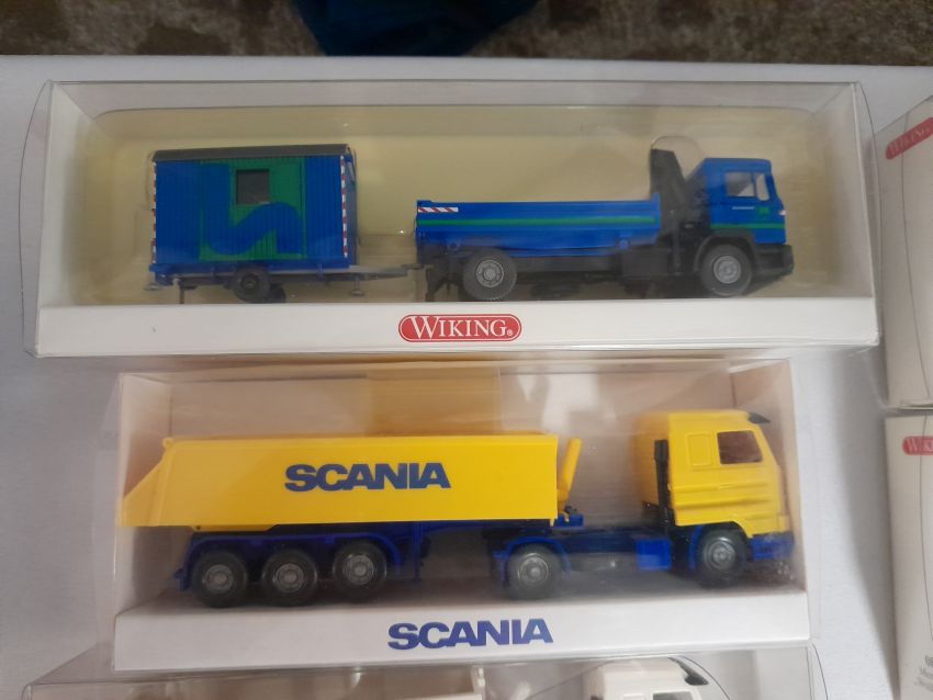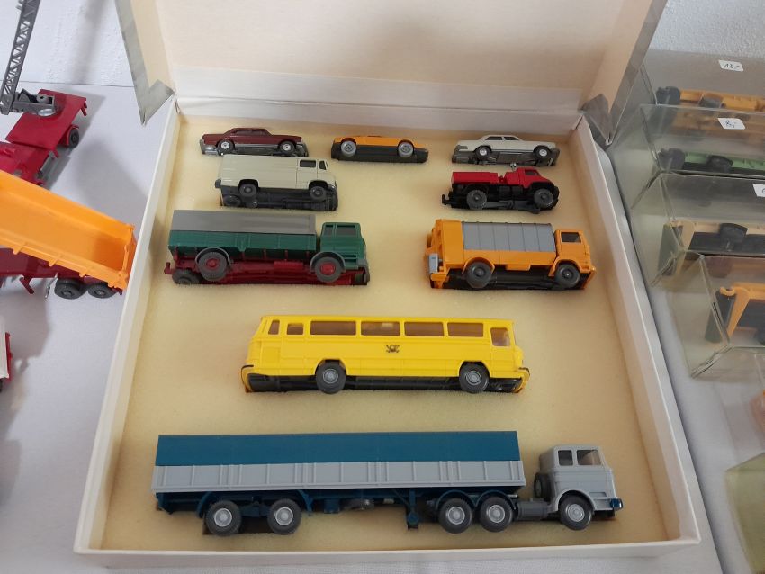 An Wiking Baufahrzeugen war alles vertreten, was das Sortiment hergibt. Lediglich der Menck Bagger im grossen Masstab war nicht dabei. Lutz hatte für seine N-Modelle einen Sandkasten mitgebracht, in dem die ganze Zeit gebaggert wurde. Es wurden wieder zahlreiche Werbe- und Sondermodelle mitgebracht, seltene Farbkombinationen waren zu bestaunen und auch wieder Modelle in Einzelteilen. Die Anzahl der ausgestellten Modelle ging in die Hunderte, was auch die vielen Bilder erklärt. Nehmt euch viel Zeit, um die Bilder ausgiebig zu betrachten. Einige Besonderheiten seien erwähnt: Henschel Readymix Betonmischer - im GK 2002 als Werbemodell, im GK 2003 als unbesetzt gelistet. Die 2-achsigen Magirus Muldenkipper sind seltene Farbkombinationen, die Baustoffwagen waren mit MB und Magirus Zugmaschinen vertreten, die sich mit unterschiedlich getönten Verglasungen und Chassis-Farbgebungen unterscheiden. Die Modelle in den Original-Verpackungen (drittletztes Bild) waren leider nicht vor Ort, da der Sammler kurzfristig aus privaten Gründen abgesagt hat. Ich wollte euch dieses Bild nicht vorenthalten.
