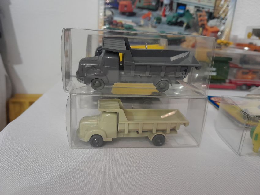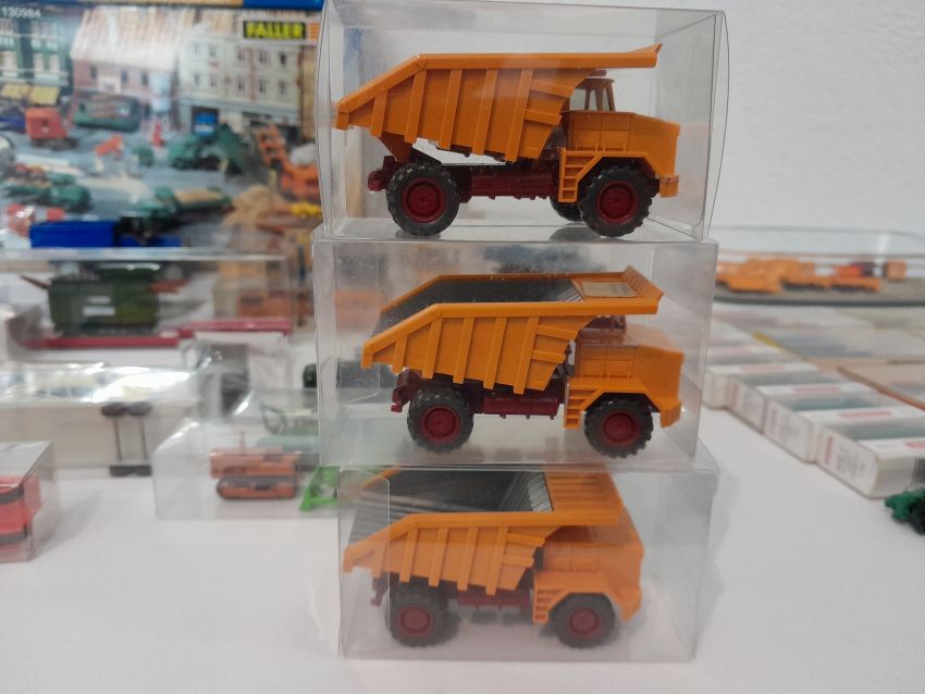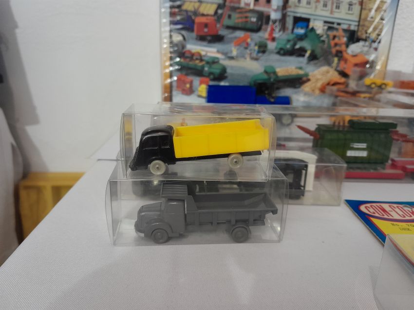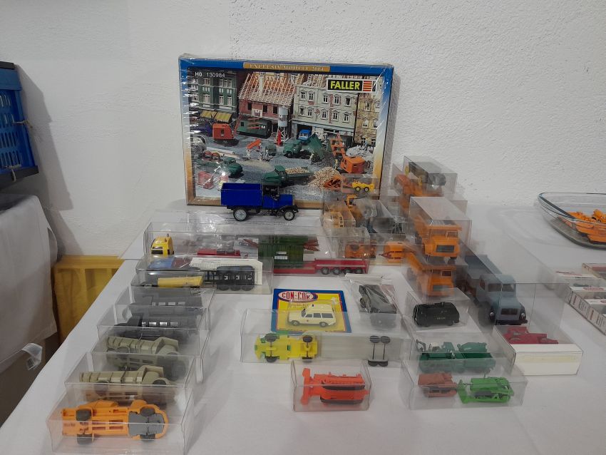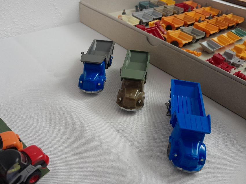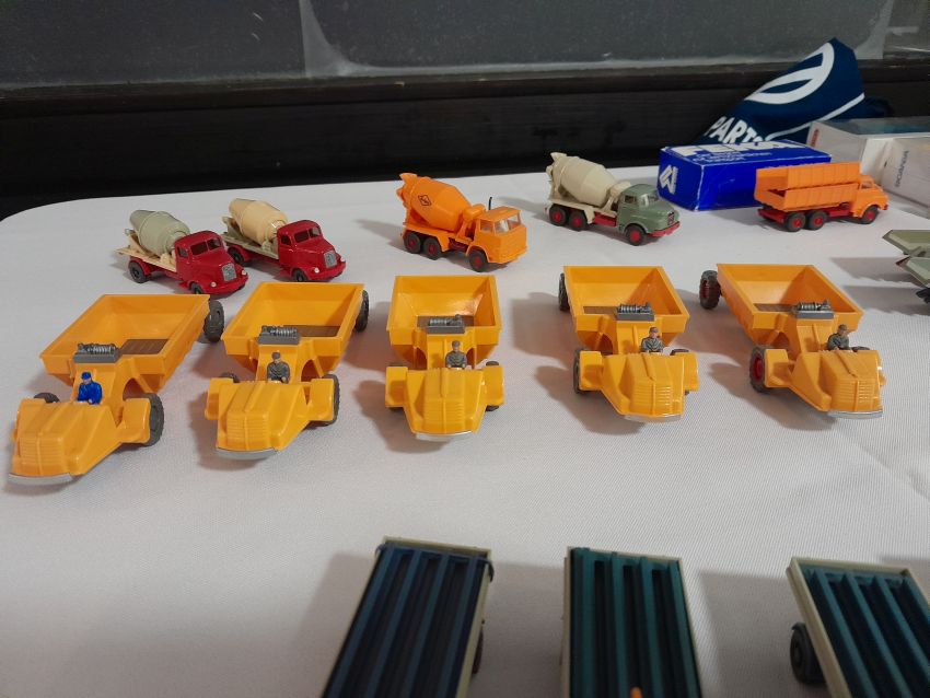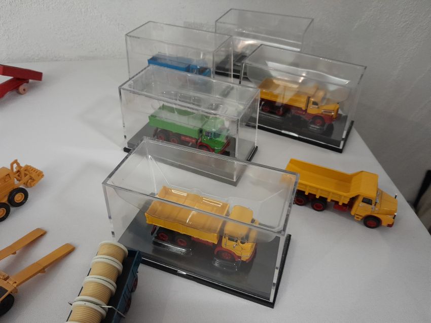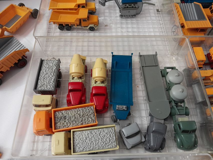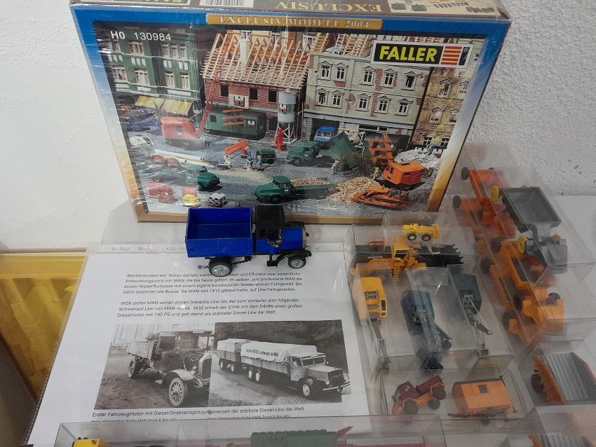 Die blauen Muldenkipper in der Gegenüberstellung sind von Manurba und Roco (mit Mechanik). Das wohl älteste Modell des Abends war der Holzmodell-Kipper aus dem Erzgebirge. Das Modell ist eine Nachkriegsproduktion, die an den Tonrädern zu erkennen ist. Weitere Modelle im H0-Masstab sind die 5 Baustellenkipper von GMTS Golden Oldies (in Klarsichtvitrine). Der graue Magirus Kipper in 1:50 ist von Conrad. Der Siemens Schwertransporter ist von einem Sammler zusammengestellt worden. Der Faller Bausatz 130984 wurde 2004 einmalig aufgelegt und beinhaltet mehrere Modelle, die über eine Steuerung gewisse Bewegungsabläufe auf der Baustelle durchführen können.