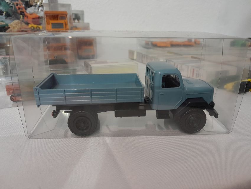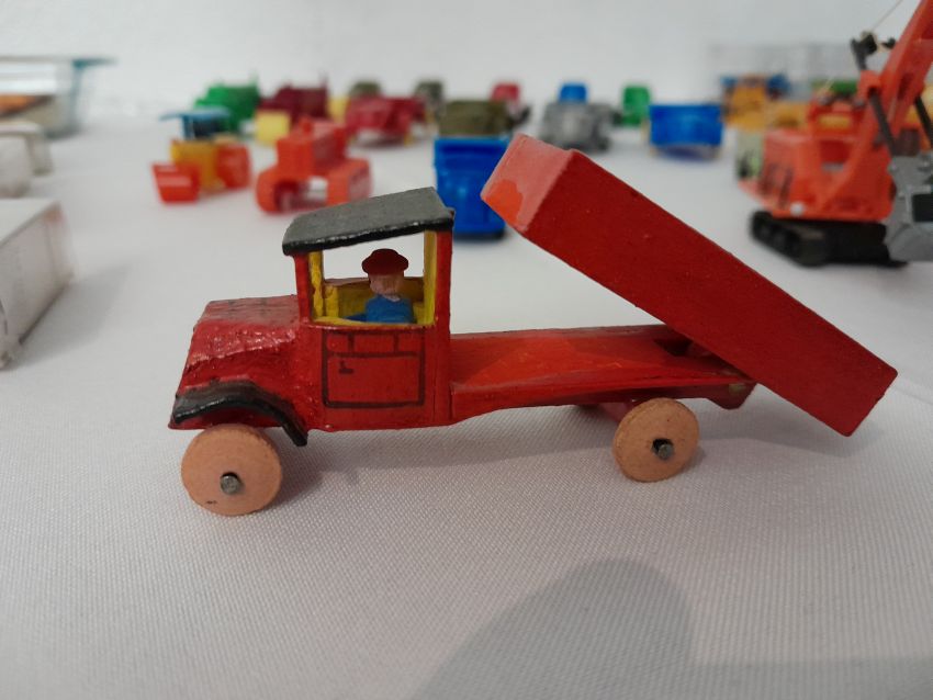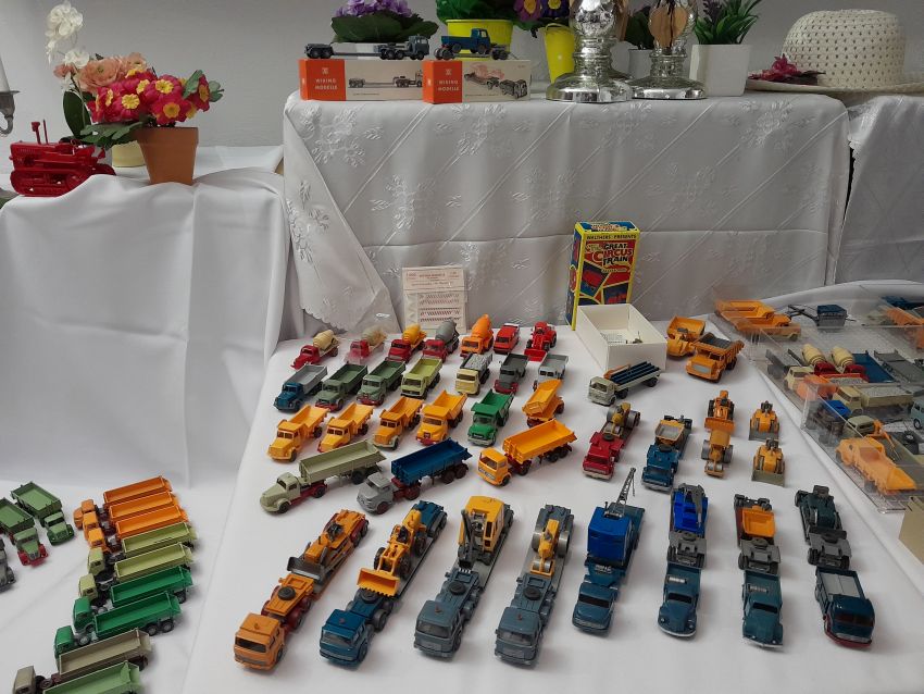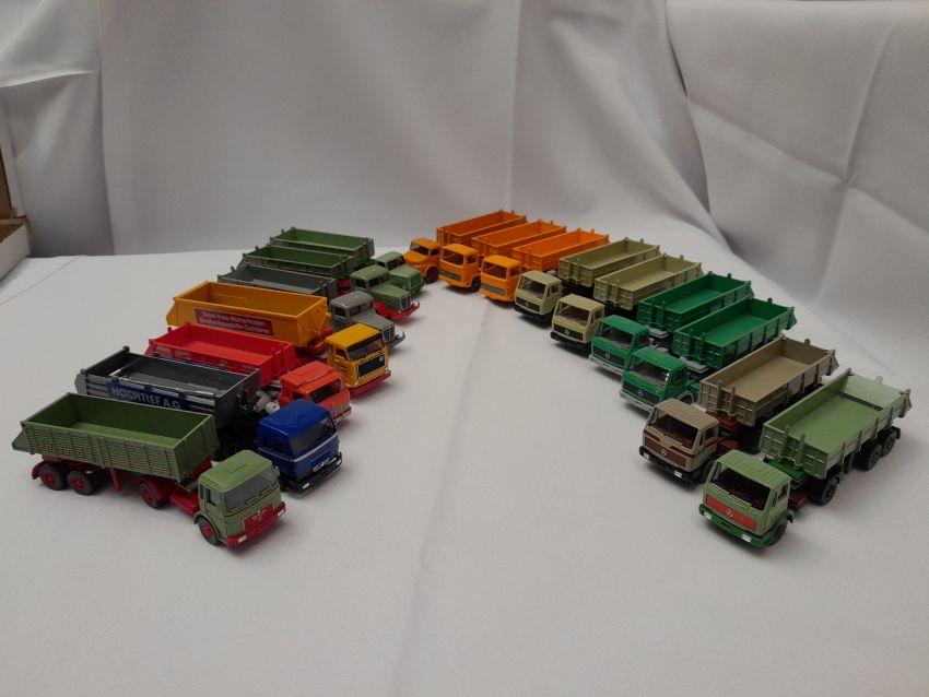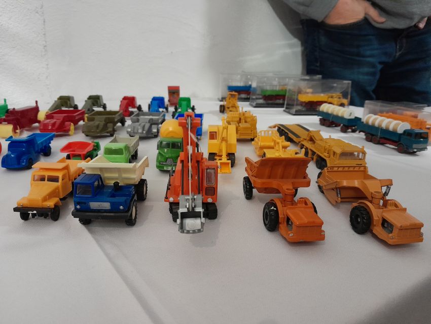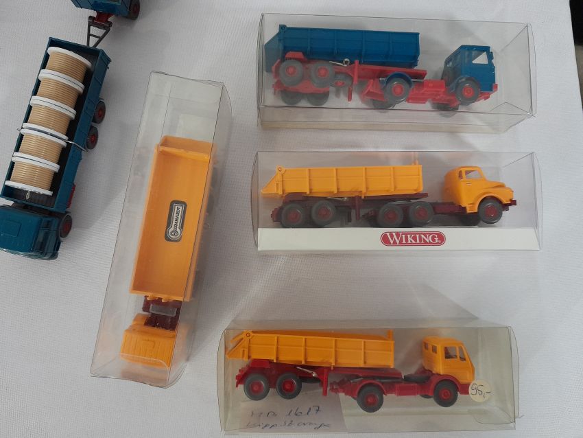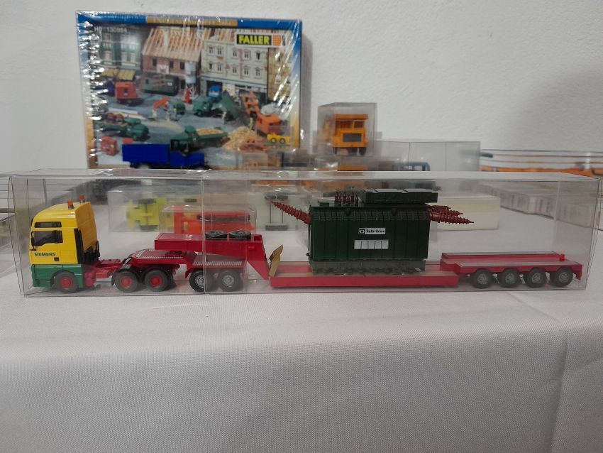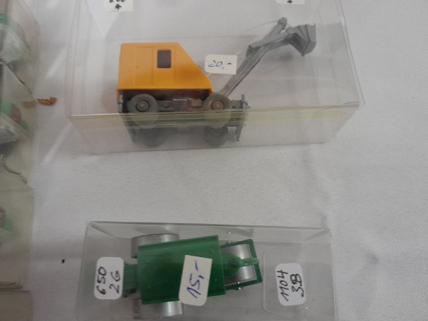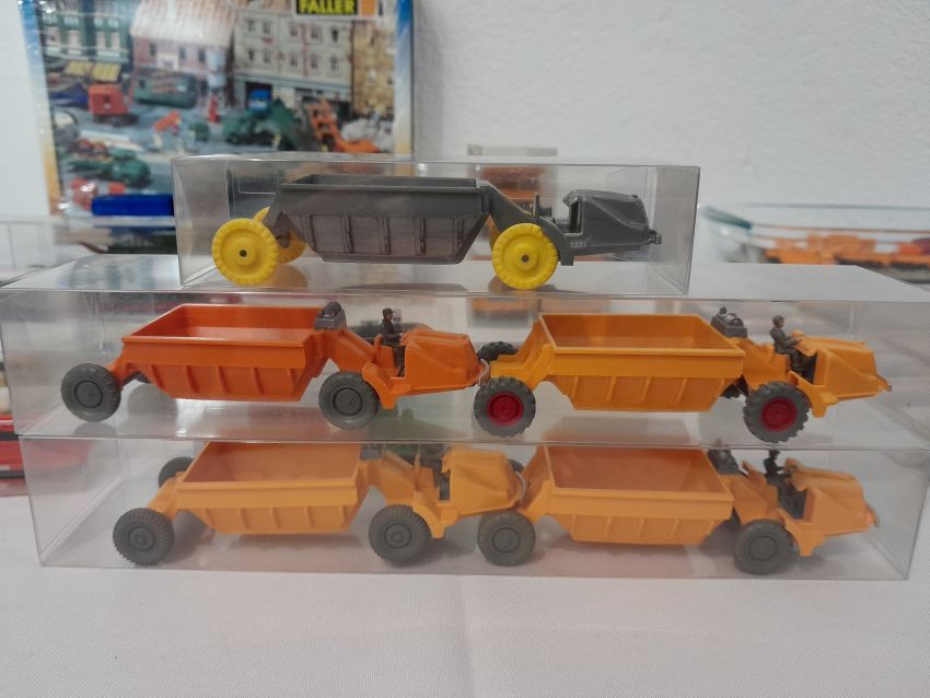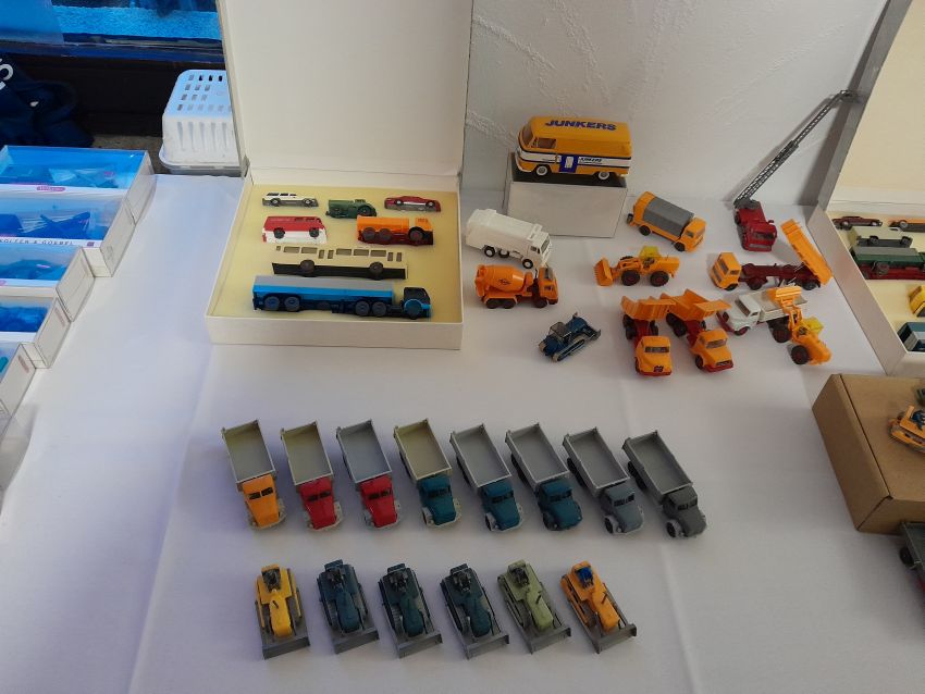 Die blauen Muldenkipper in der Gegenüberstellung sind von Manurba und Roco (mit Mechanik). Das wohl älteste Modell des Abends war der Holzmodell-Kipper aus dem Erzgebirge. Das Modell ist eine Nachkriegsproduktion, die an den Tonrädern zu erkennen ist. Weitere Modelle im H0-Masstab sind die 5 Baustellenkipper von GMTS Golden Oldies (in Klarsichtvitrine). Der graue Magirus Kipper in 1:50 ist von Conrad. Der Siemens Schwertransporter ist von einem Sammler zusammengestellt worden. Der Faller Bausatz 130984 wurde 2004 einmalig aufgelegt und beinhaltet mehrere Modelle, die über eine Steuerung gewisse Bewegungsabläufe auf der Baustelle durchführen können.