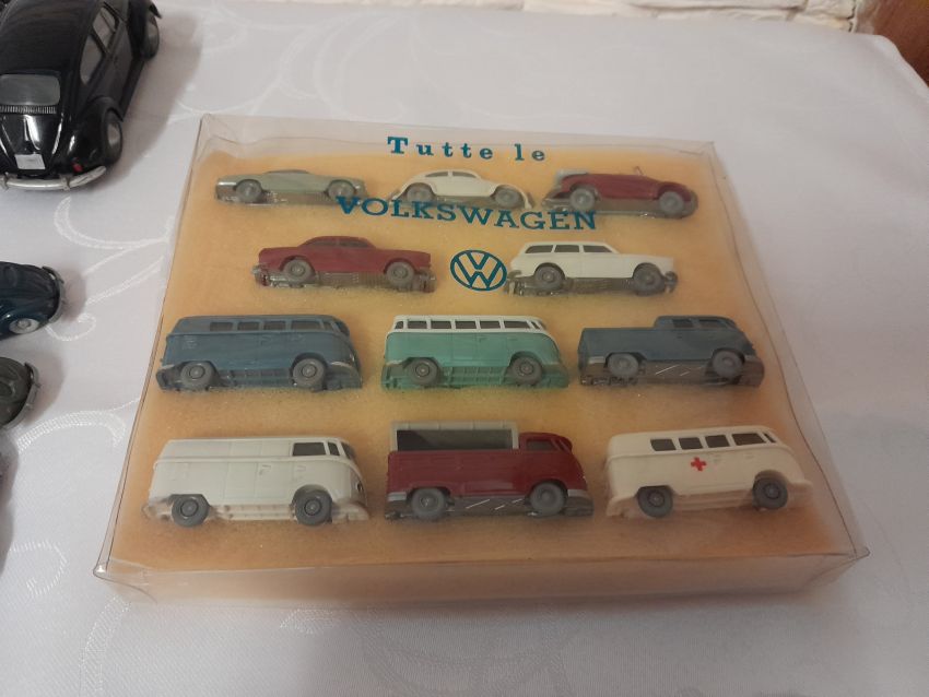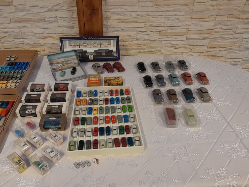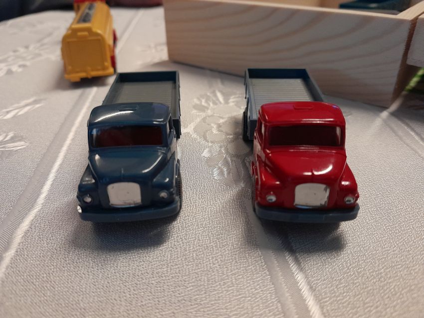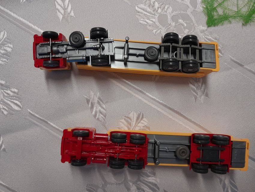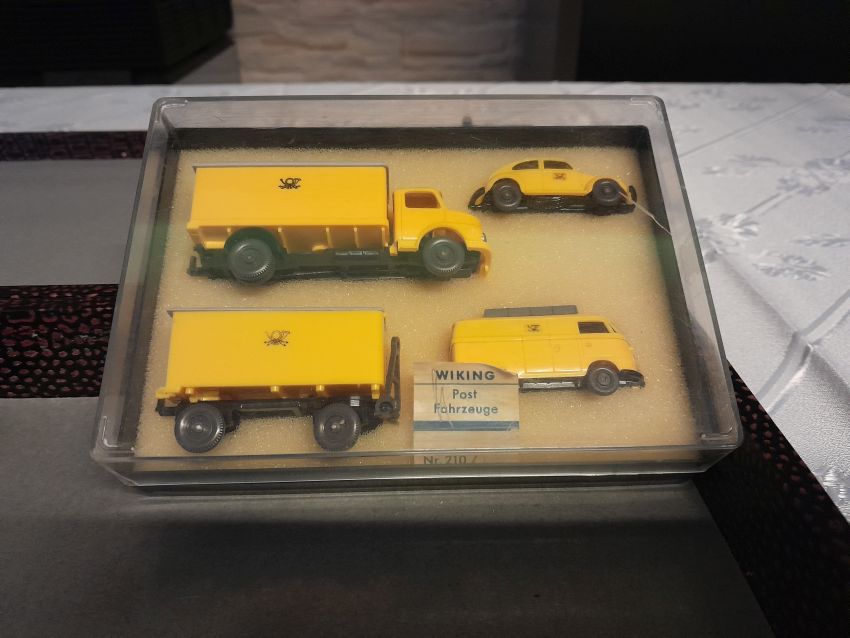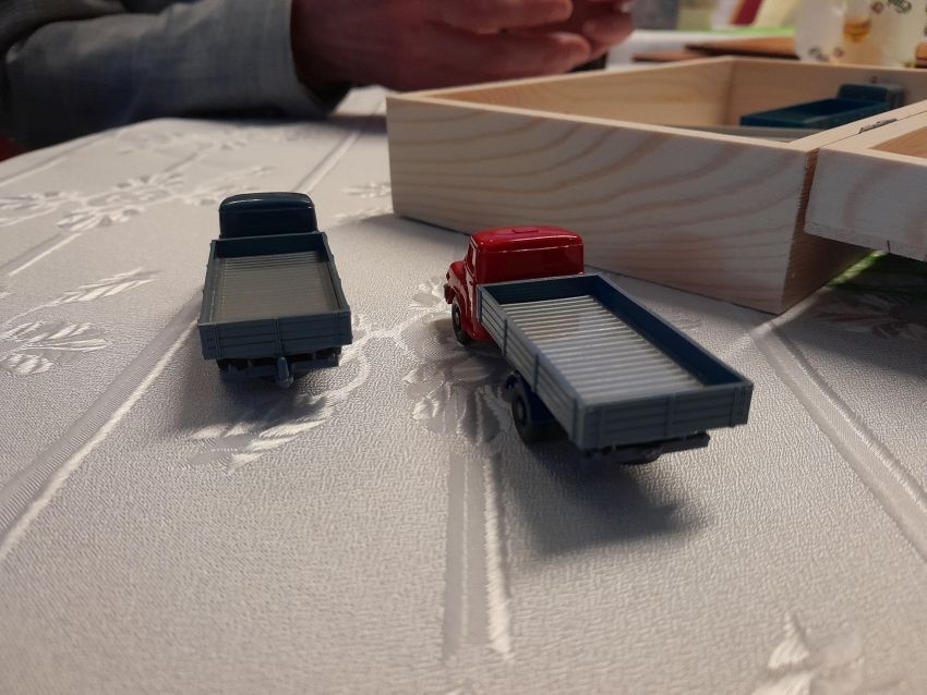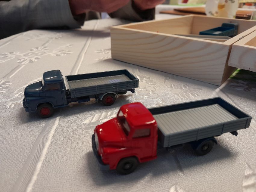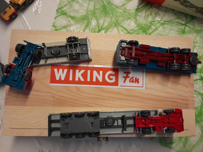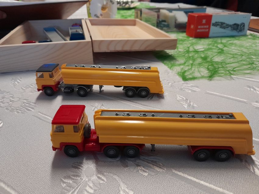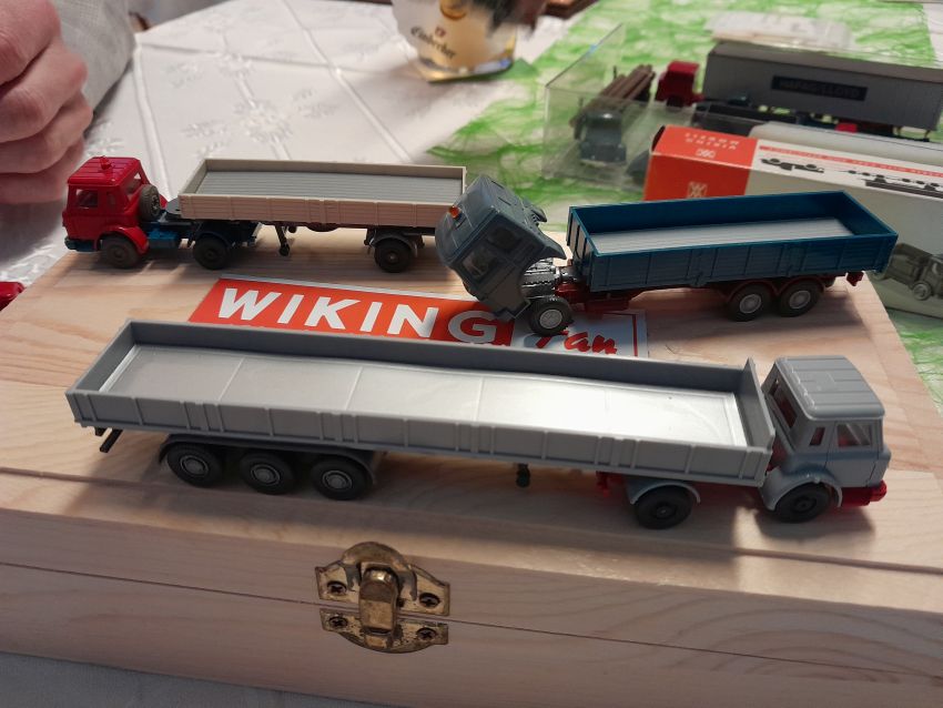Ein Sammler hatte besondere Lkw Modelle dabei, die er von einem Wiking Heimarbeiter in Berlin erstanden hat. Zwei unbedruckte Scania Tanksattelzüge mit zwei- und dreiachsiger Zugmaschine und unterschiedlichen Achshalterungen am Auflieger. Mehrere Lkw Modelle, die es in dieser Ausführung nicht im Wiking Sortiment gab. Dazu 2 MAN Pritschen Lkw ohne Kühlergrill.