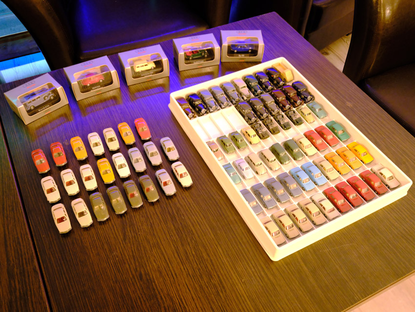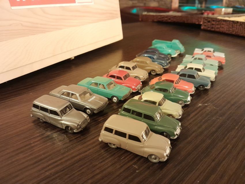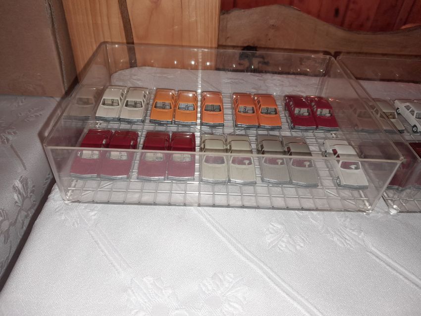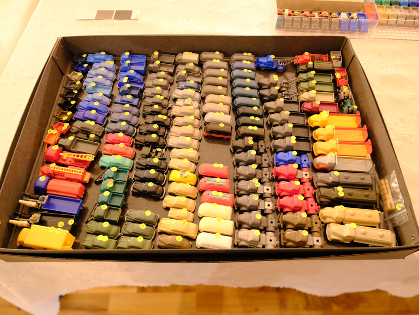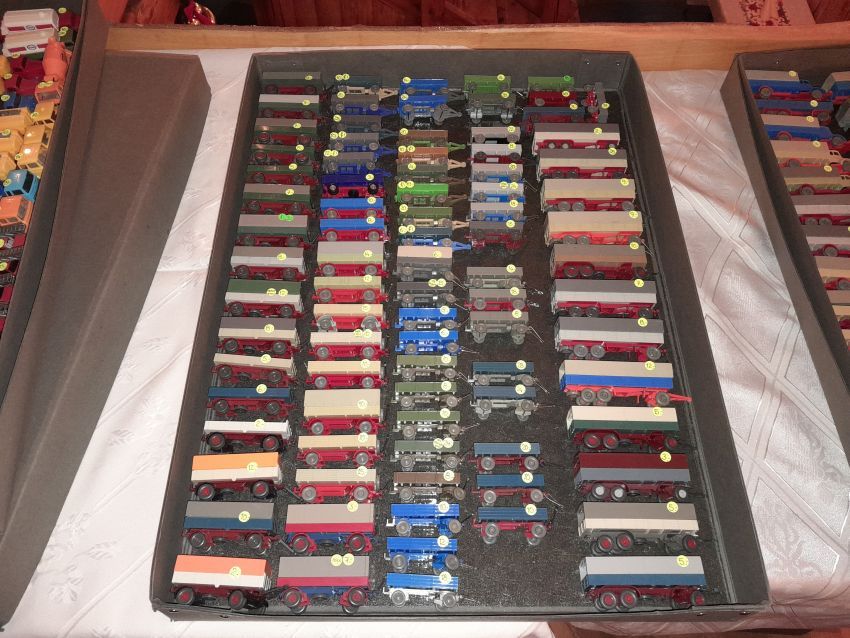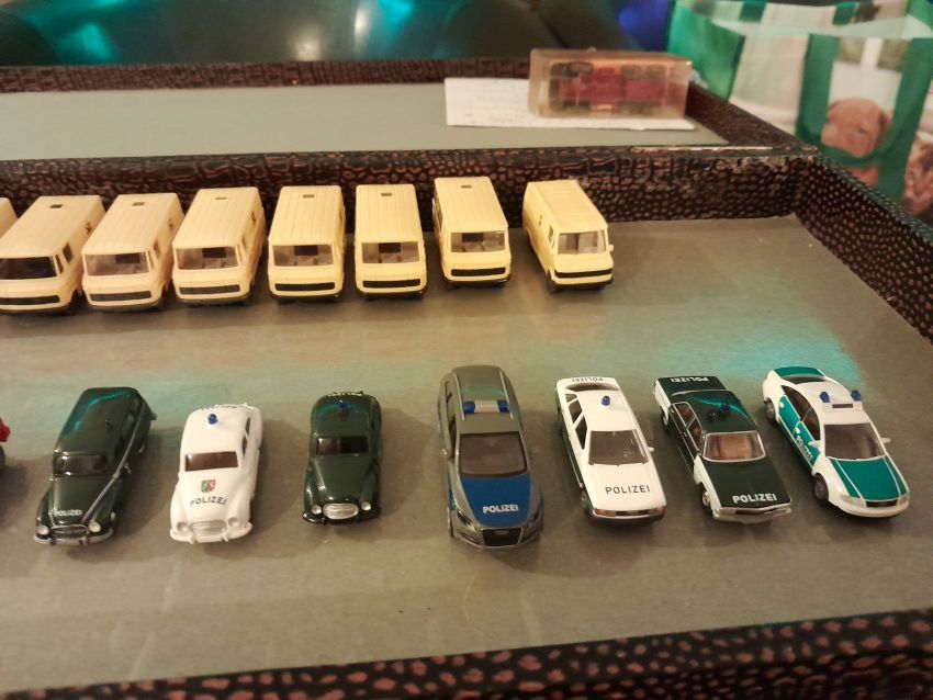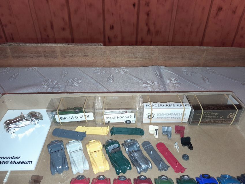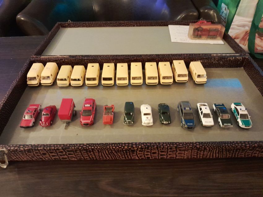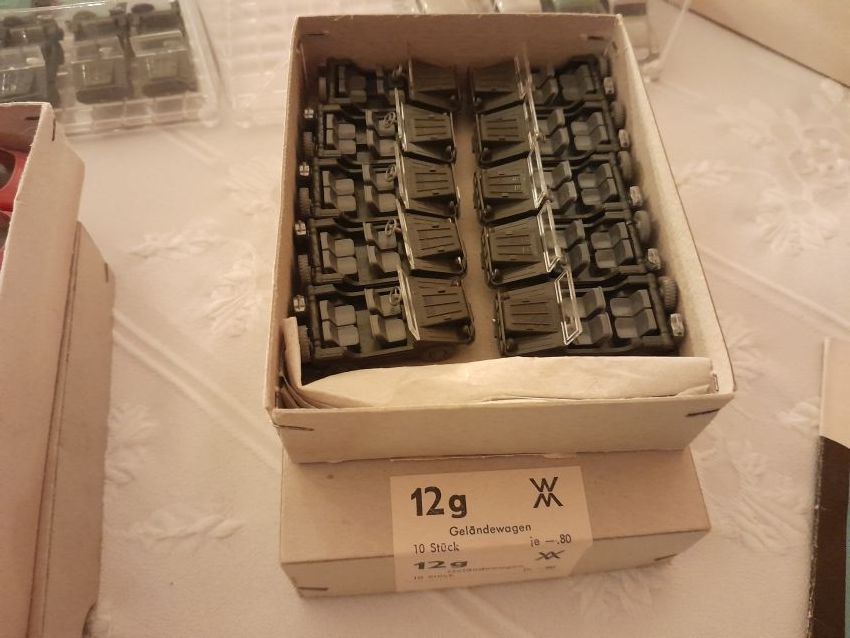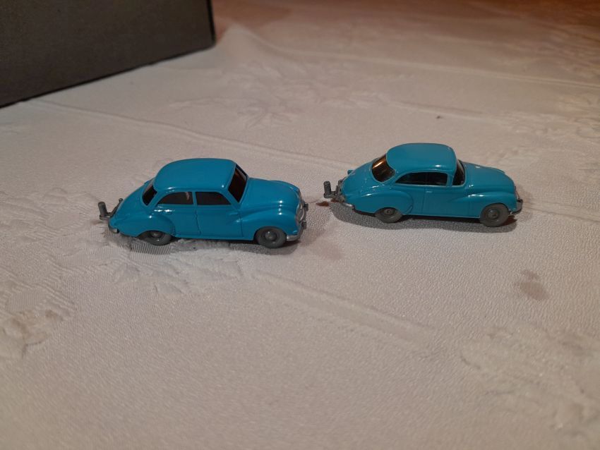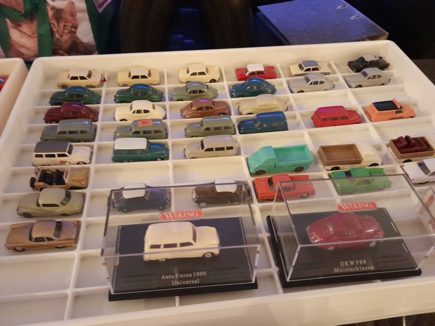 DKW: sowohl verglaste als auch unverglaste DKW-Exemplare wurden präsentiert: DKW Limousine und Coupe, DKW Junior, DKW F89, DKW Universal, der Geländewagen DKW-Munga, DKW Spezial. Auch hier waren einige wenige Blaulicht-Varianten vertreten. Ein Sammler hat wieder unverklebte Einzelteile von DKW-Modellen zusammengestellt. Bei den unverglasten Modellen hatten Sammler zahlreiche DKW Limousinen und Pritschenwagen in unterschiedlichsten Farben, mit und ohne Beladung mitgebracht. Zu beachten sind wieder die vollbestückten Händlerkartons #12a DKW-Junior, #12g Geländewagen, #12n DKW de Luxe und #36 DKW Pritschenwagen. Äußerst selten und nicht ganz günstig: DKW Coupe in babyblau mit Zughaken und DKW Limousine mit Zughaken in taubenblau. Ich hoffe, die Farbangaben stimmen.