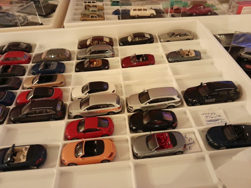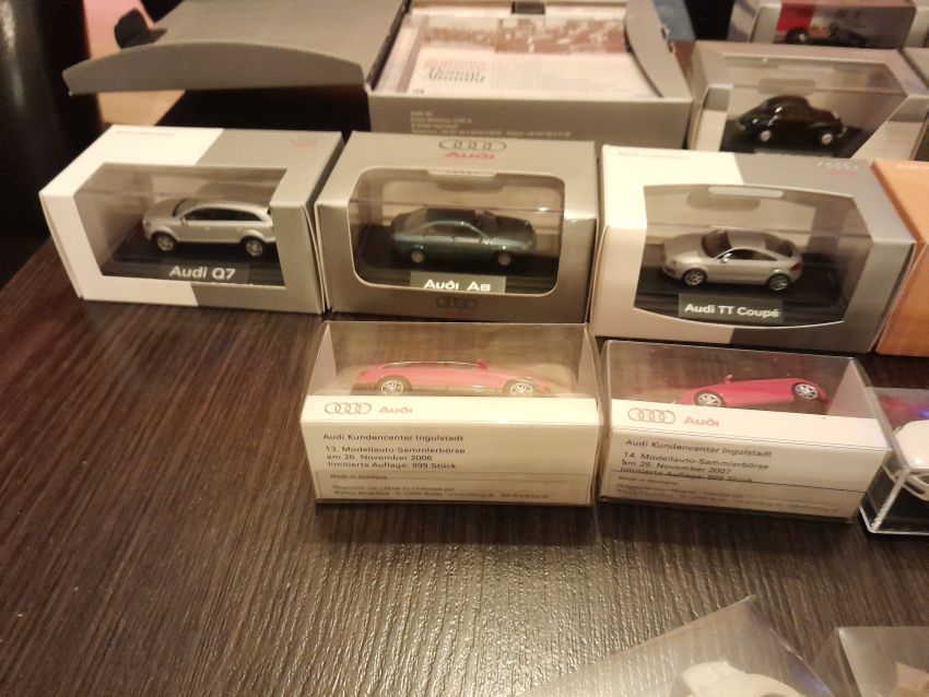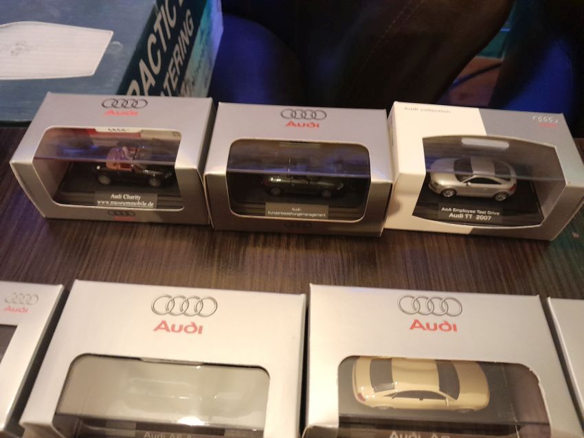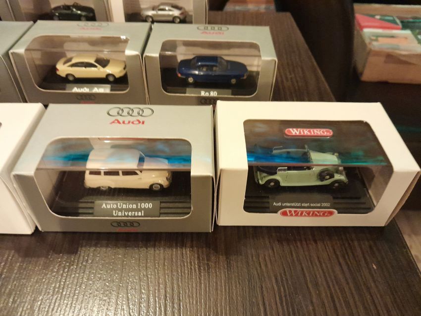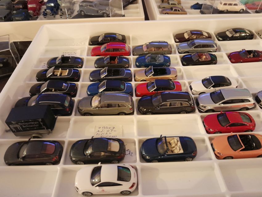 Audi: hier waren natürlich die modernen Modelle wie A4 Cabrio, A6 Avant, Q7, TT Coupe und TT Roadster mit entsprechenden Sonder- bzw. Werbemodellen von Audi gut vertreten. Charity-Modelle und die Modelle von der Automodellbörse in Ingolstadt. Audi 50, 80 und 100 waren in vielen Farbgebungen vertreten. Ein Sammler hatte auch entsprechende Blaulicht-Modelle ausgestellt. An Oldtimern hat Wiking lediglich das Audi Front Cabrio im Sortiment, das in allen Farben zu finden war. Uwe hat uns wieder mit einem beleuchteten Audi TT Roadster und einem seltenen Minichamps 1:43er Audi R8 V10 plus Coupe erfreut.
