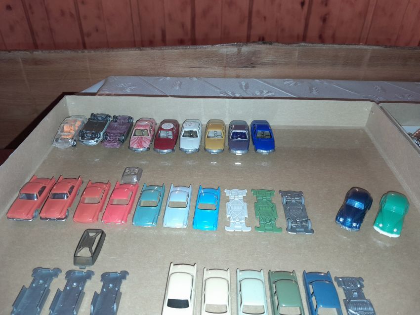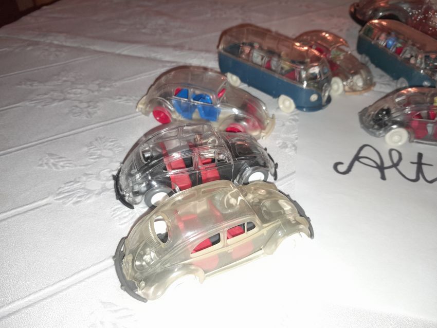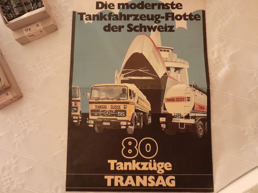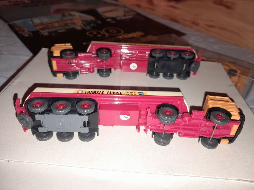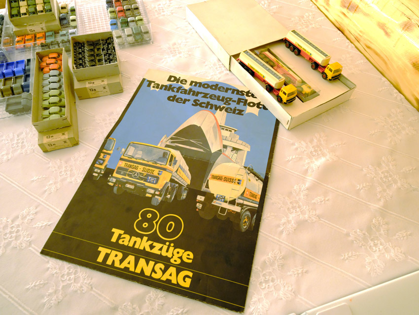 Jetzt kommen wir zu den Modellen, die nicht zum Themen-Schwerpunkt des heutigen Sammlerabends gehören: Unser 1:40er Sammler hat unter dem Thema Edel-Brennstoff, 1. Käfer Club Wolfsburg e.V., einige sehr seltene transparente Käfer und VW T1 Bus Modelle ausgestellt. Als besonderes Highlight ist sicher der transparente Käfer im Masstab 1:19 aus portugiesischer Produktion zu nennen. Natürlich haben sich auch diverse NSU Ro 80 Modelle aus Wiking Produktion auf den Tischen eingefunden. Zwei schöne Audi 100 Limousinen in 1:43 hatten sich auch nach Heinde verfahren. Ein weißes und ein rotes Modell mit einer neutralen silberfarbenen Verpackung mit technischen Daten zum Vorbild. In der Horch-Präsentation unseres Sammlers befinden sich neben den Horch Limousinen auch BMW 328 Modelle in Einzelteilen, entsprechende BMW-Sondermodelle und ein verchromtes Modell mit Handbuch Remember Rolling BMW Museum. Und dann war da noch die modernste Tankfahrzeug-Flotte der Schweiz: 80 Tankzüge TRANSAG. Zwei von den 80 Tanksattelzügen hat der Sammler ausgestellt. Die Modelle laut Saure aus dem Jahr 1973 unterscheiden sich in der Farbe der Inneneinrichtung und der Klemmplatte am Auflieger. Ein Sattelzug hat ein Reserverad hinter dem Führerhaus. Die Tankauflieger verfügen über keine Aufstiegsleiter am Heck.